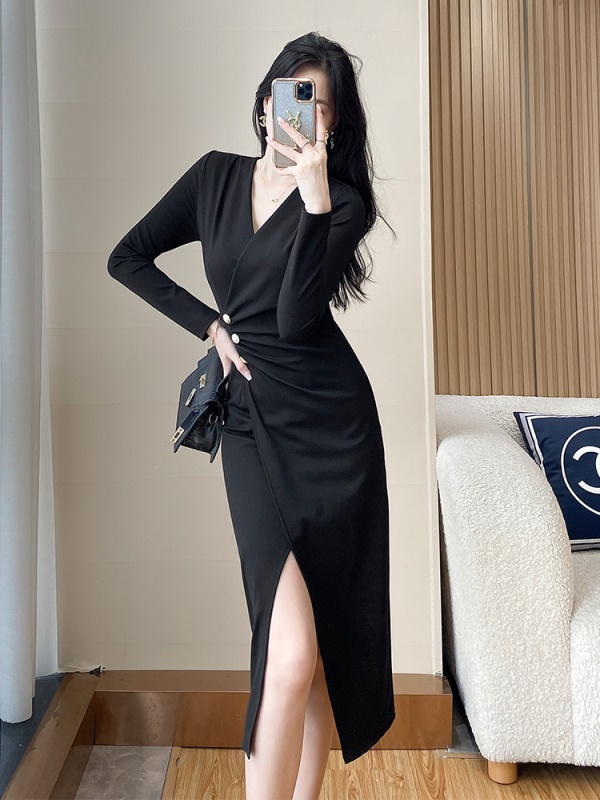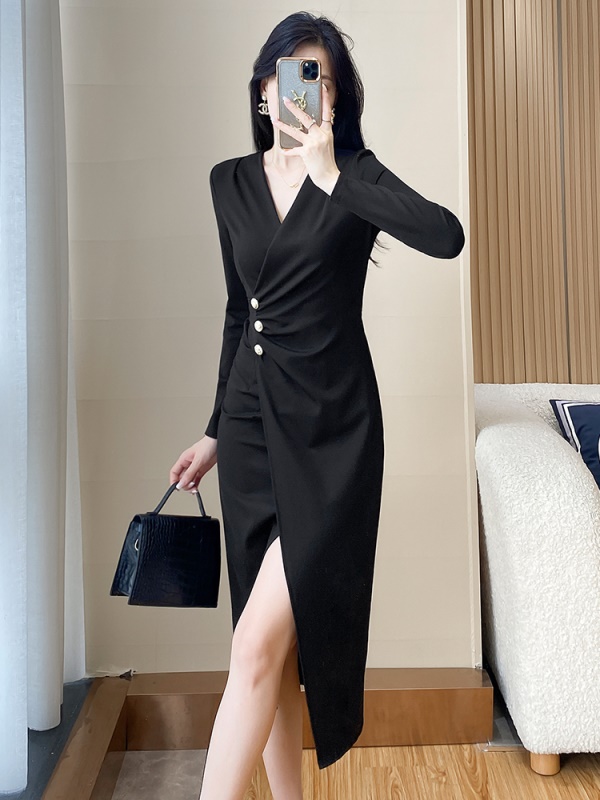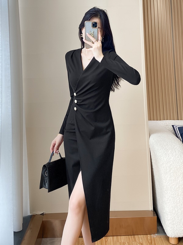 商品名称:气质法式高端奢华大牌高级感小黑裙长袖开叉黑色职业连衣裙秋冬季