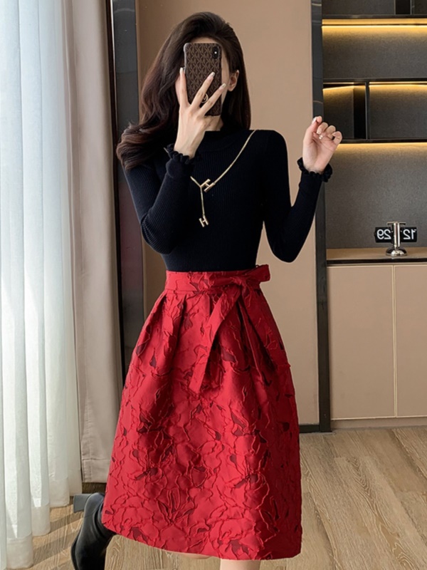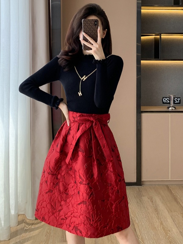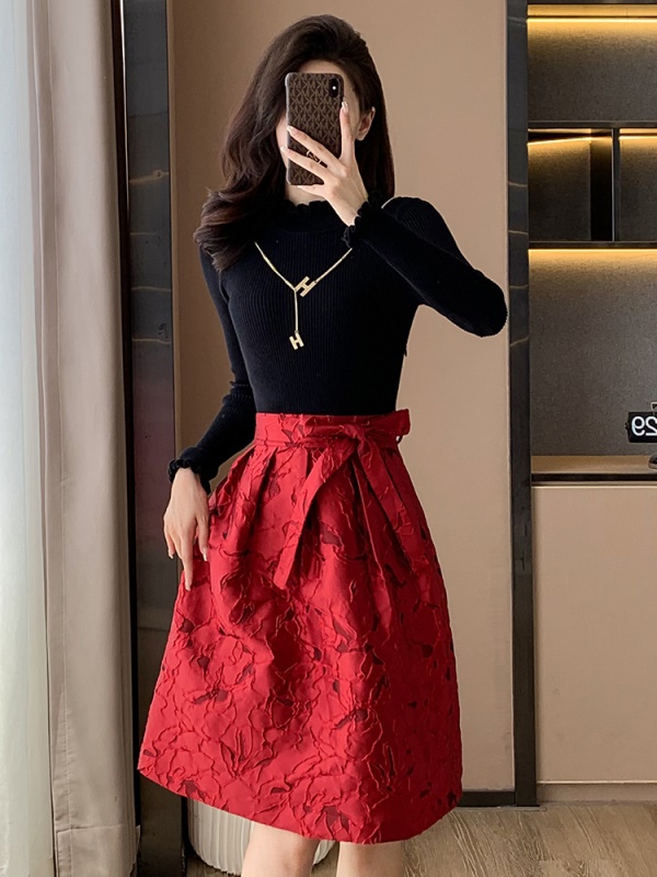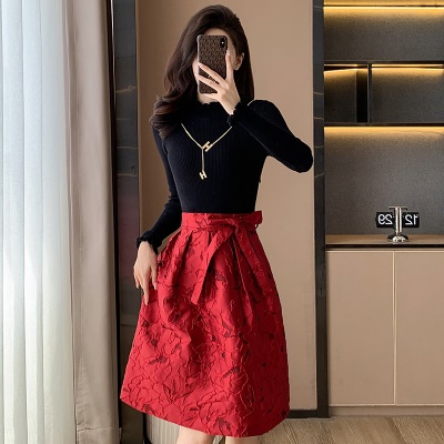 商品名称:秋冬季红色礼服提花修身显瘦毛衣国风中式连衣裙小个子喜庆高级感