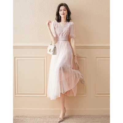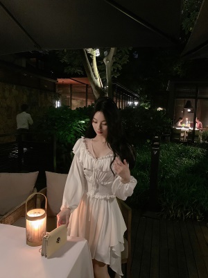 ByYou 夏季新款气质网纱V领缎面白色连衣裙收腰显瘦不规则短裙子