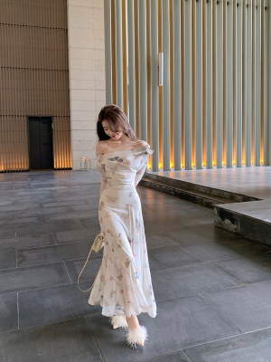 ByYou 夏季新款设计感白色一字肩印花连衣裙收腰显瘦露肩长款裙子