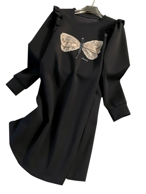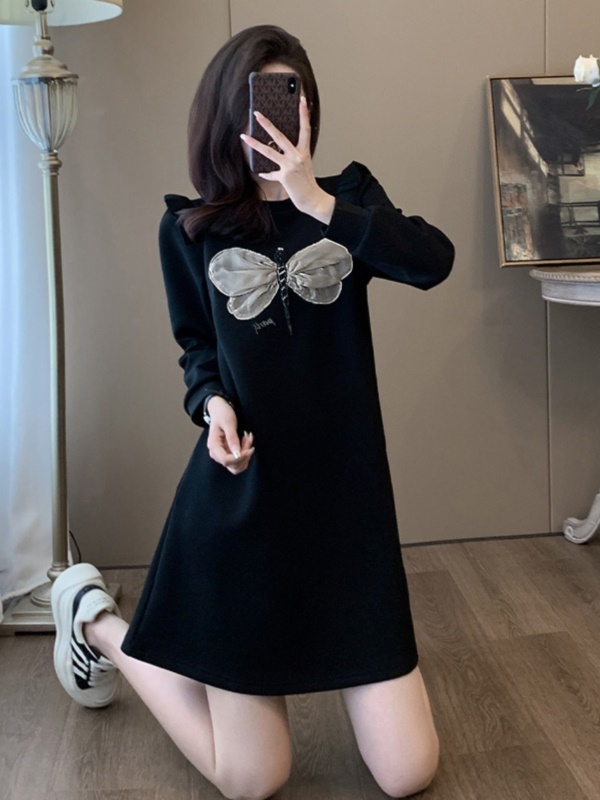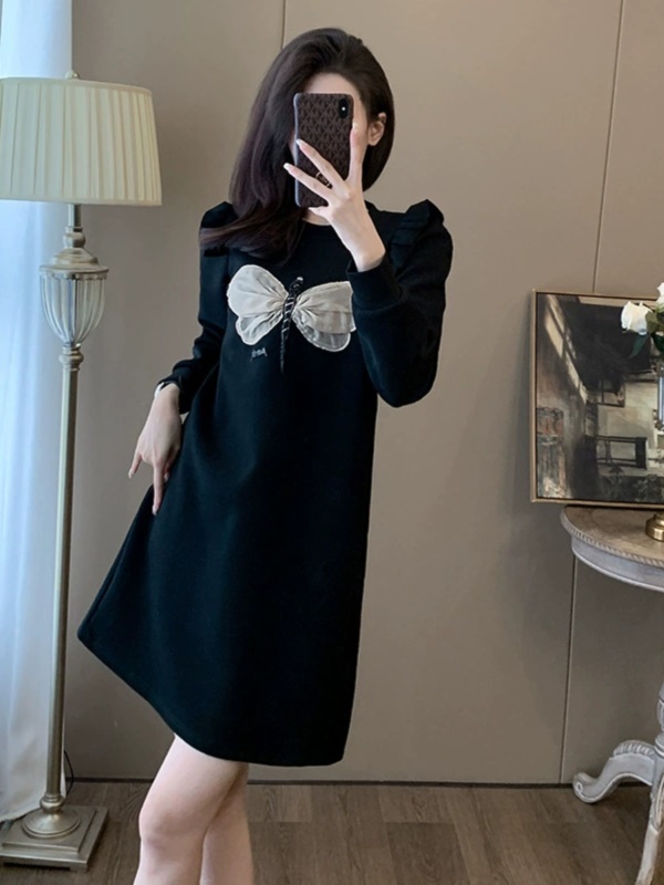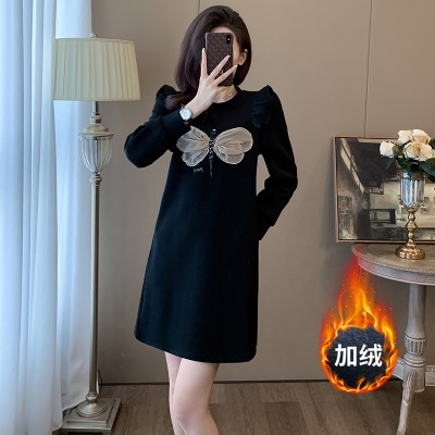 秋冬季黑色加绒加厚气质连衣裙高级感长袖宽松显瘦减龄裙子小个子
