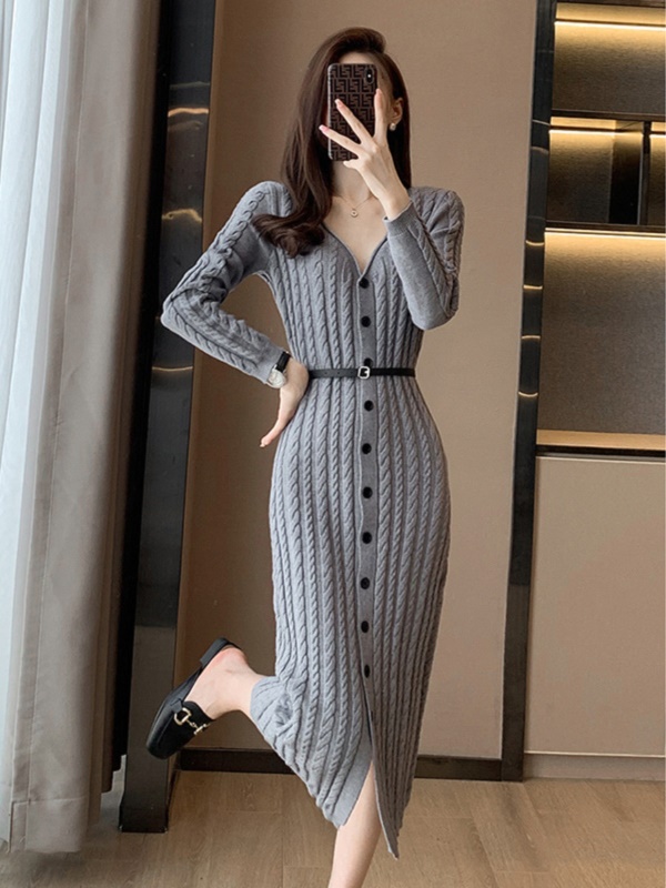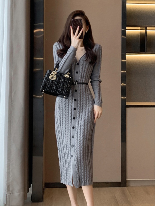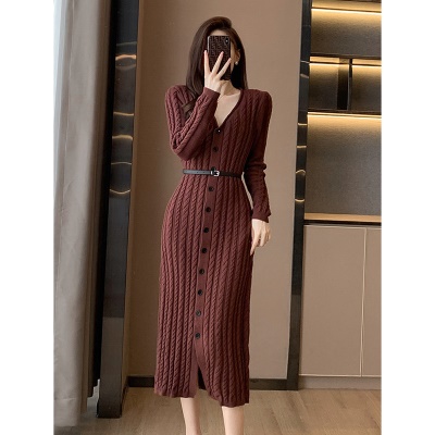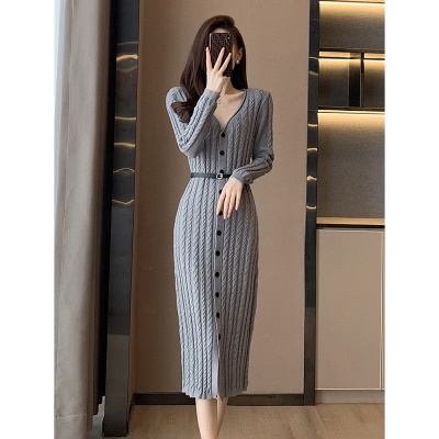 商品名称:秋冬针织连衣裙高端气质高级感修身包臀配大衣的V领毛衣内搭长裙