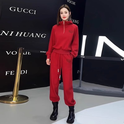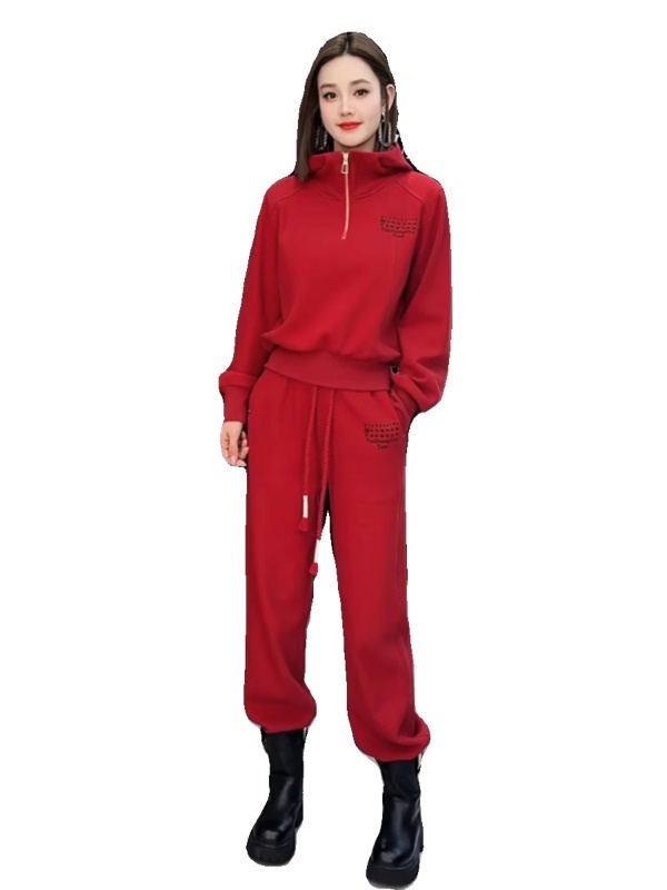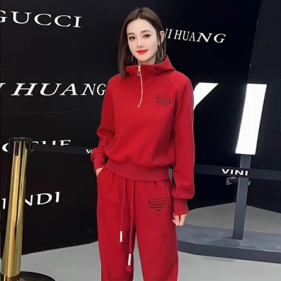 商品名称:加绒加厚红色新年休闲运动套装女秋冬季新款时尚卫衣卫裤两件套装