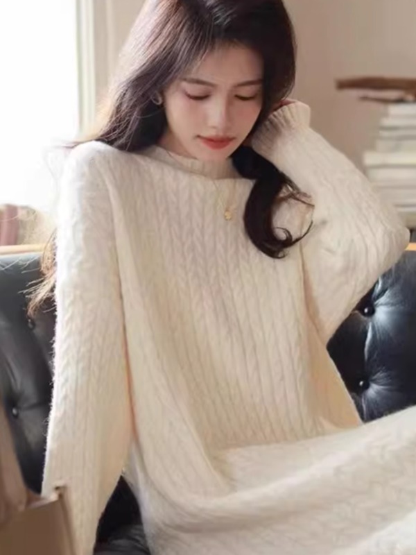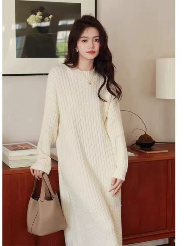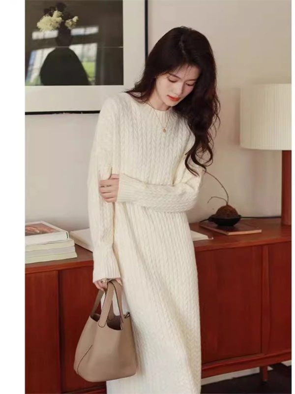 秋冬新款宽松显瘦白色针织连衣裙女中长款打底毛衣裙配大衣的内搭