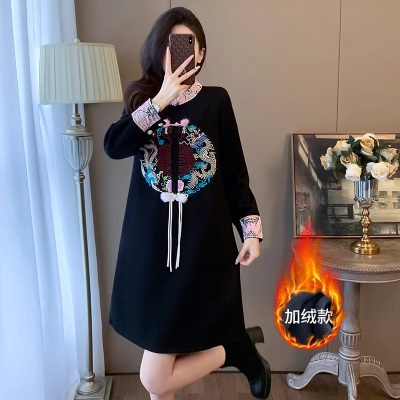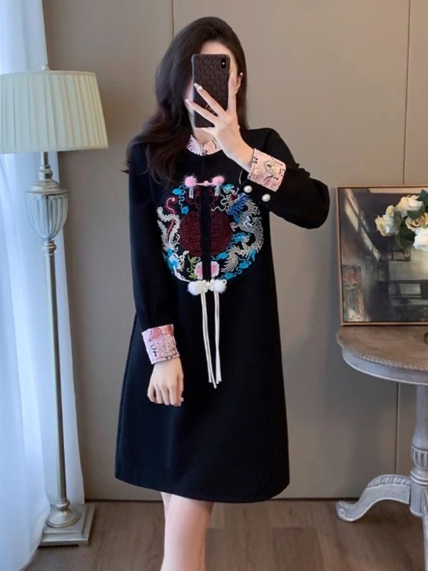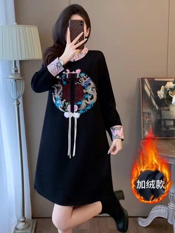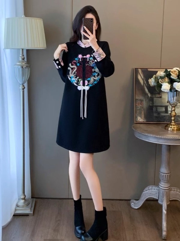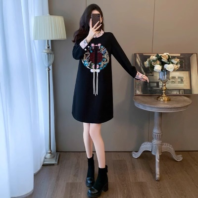 新中式国风刺绣高端精致连衣裙女秋冬季新款高级感宽松显瘦黑裙子