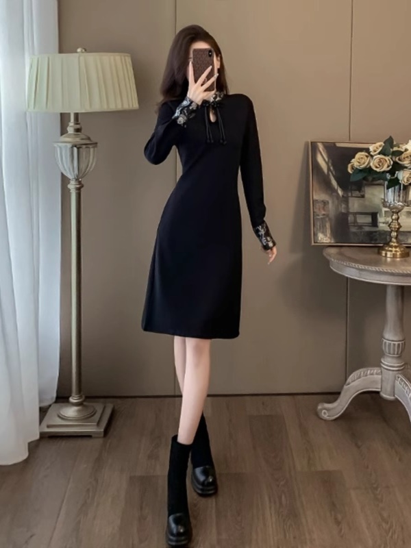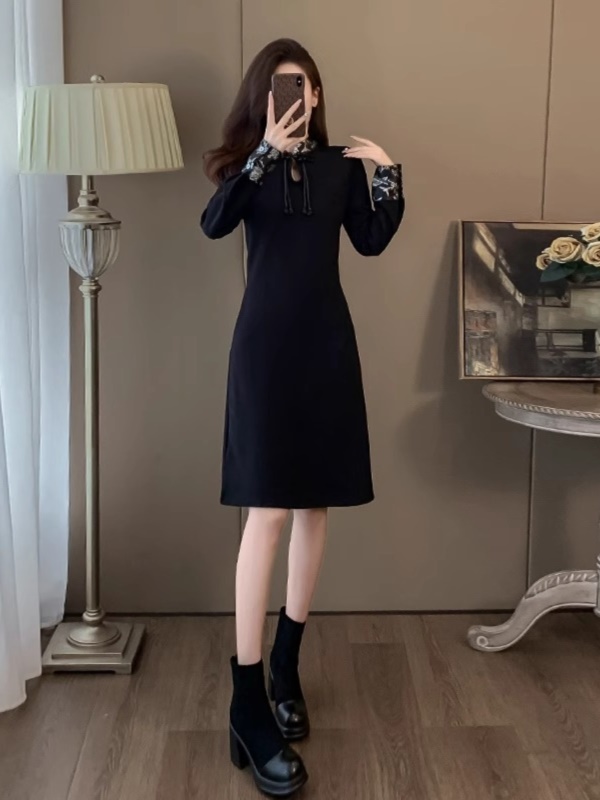 新中式国风旗袍连衣裙女秋冬新款显瘦气质内搭打底加绒赫本小黑裙