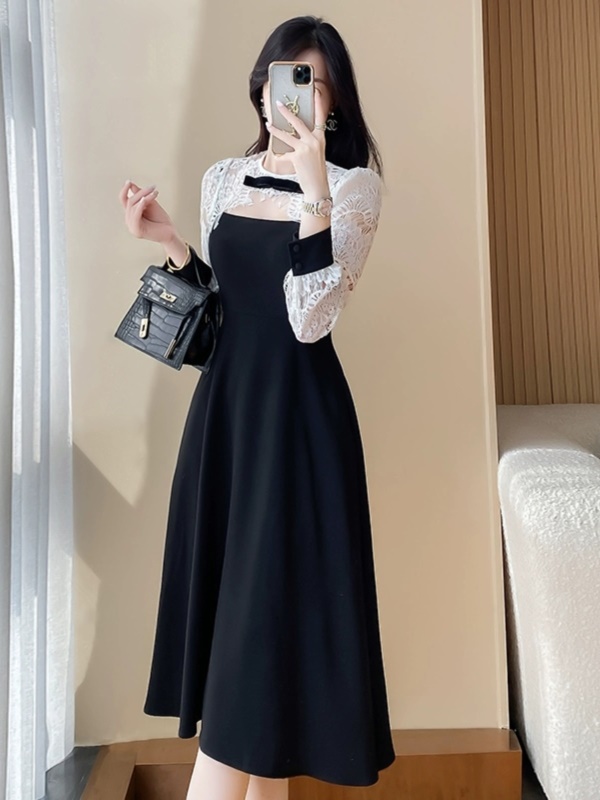 蕾丝拼接黑色连衣裙女2025春装新款高级感收腰显瘦气质赫本晚礼服