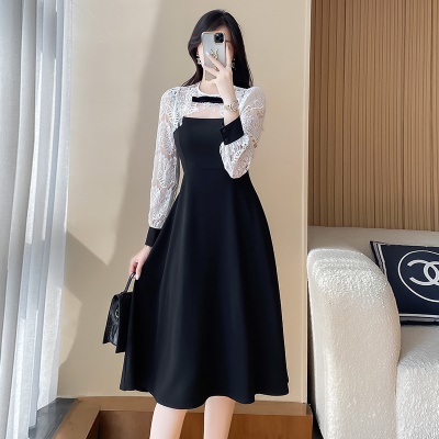 商品名称:蕾丝拼接黑色连衣裙女2025春装新款高级感收腰显瘦气质赫本晚礼服