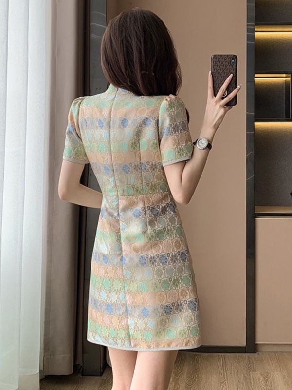 新中式国风立领盘扣改良旗袍连衣裙女小个子收腰显瘦开叉裙短裙夏