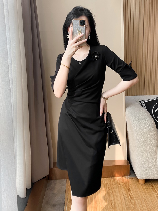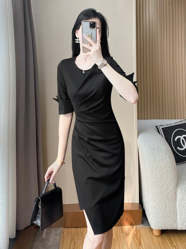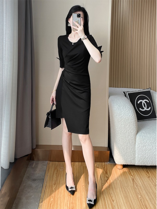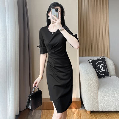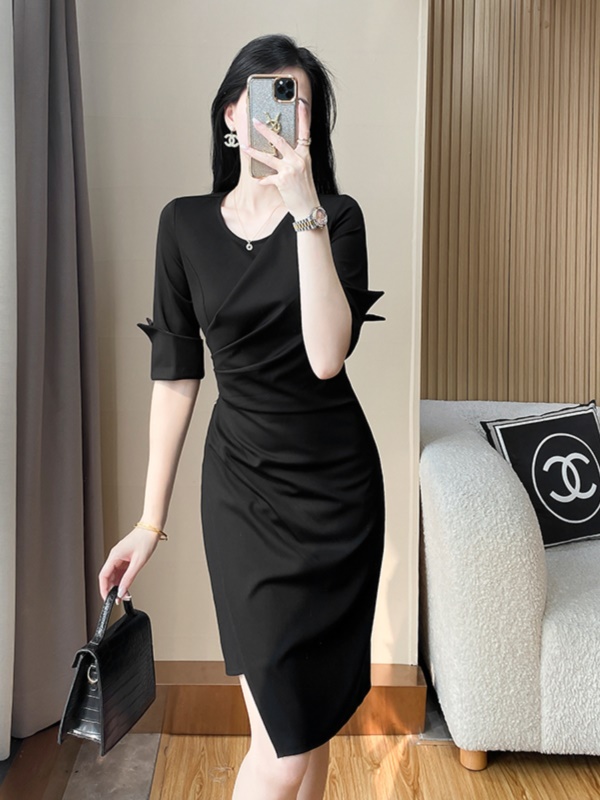 黑色包臀职业OL连衣裙女春夏新款高端V领修身气质皱褶显瘦小黑裙