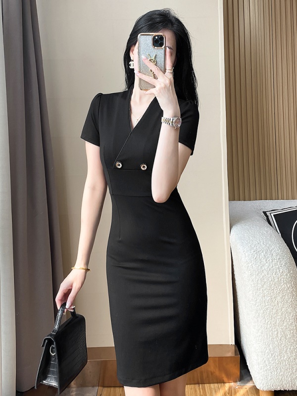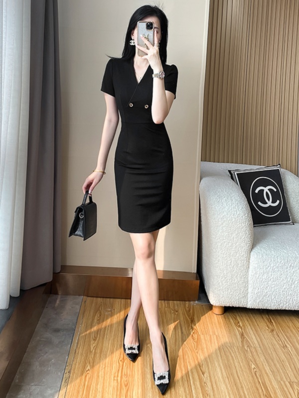赫本风气质修身包臀职业连衣裙女神范轻奢显瘦v领小黑裙夏高级感
