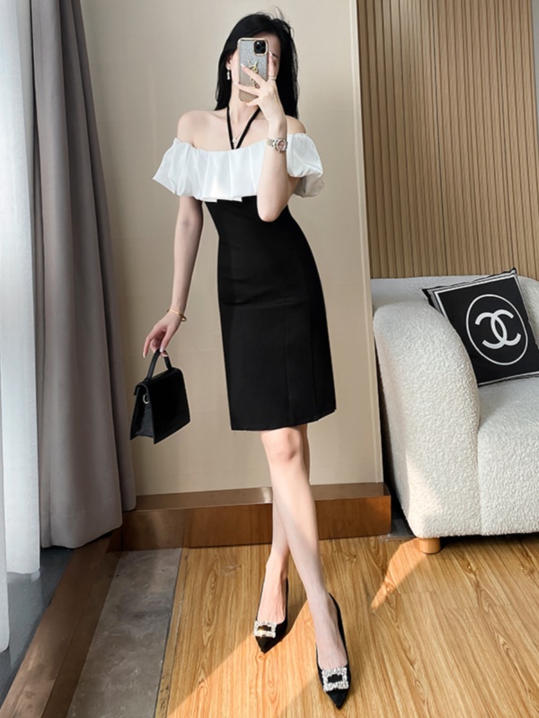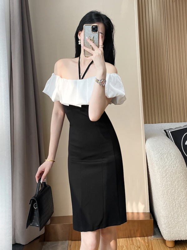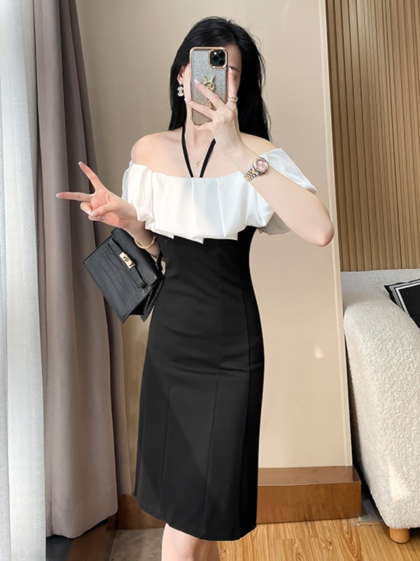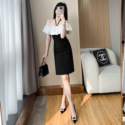 商品名称:法式复古赫本风高腰显瘦一字领挂脖连衣裙子女夏气质高级感晚礼服