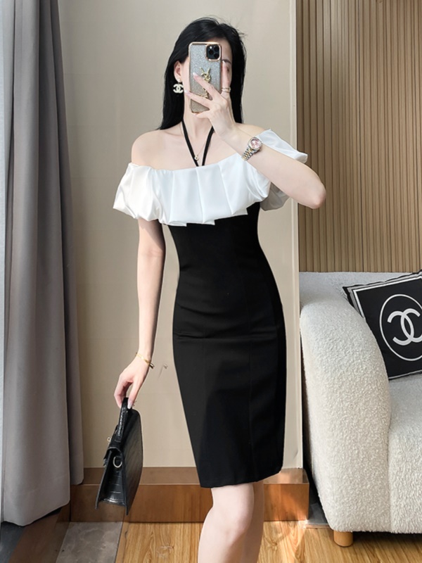 法式复古赫本风高腰显瘦一字领挂脖连衣裙子女夏气质高级感晚礼服