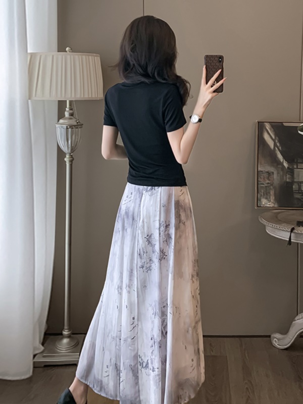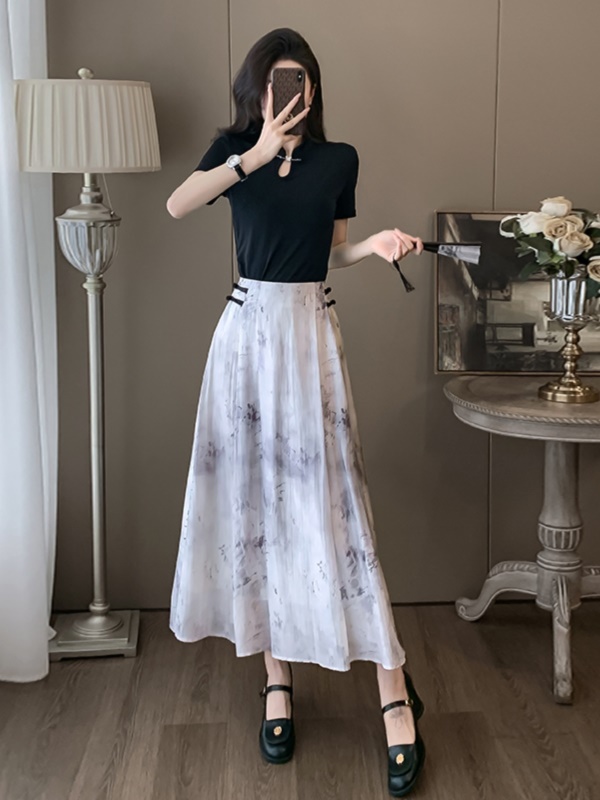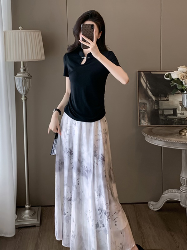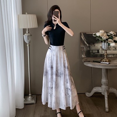 商品名称:新中式国风时尚套装裙子女夏新款修身显瘦黑色水墨画半身裙两件套