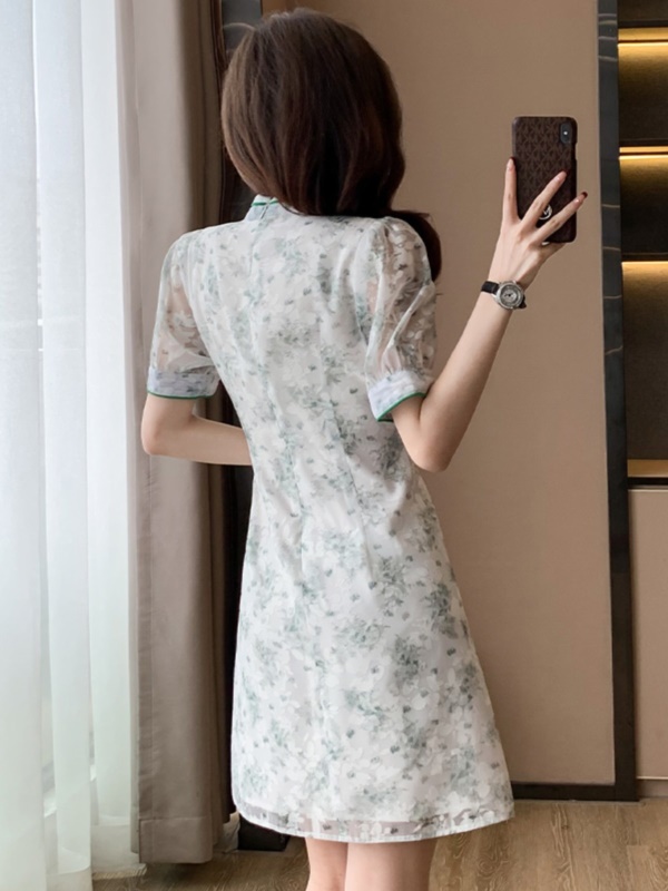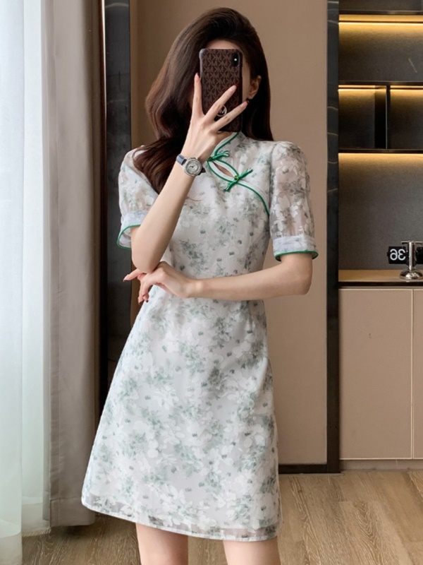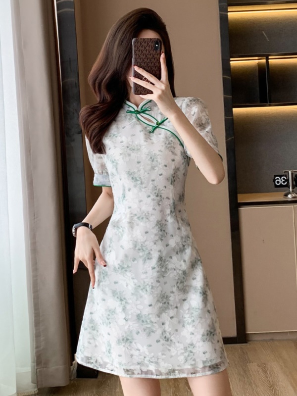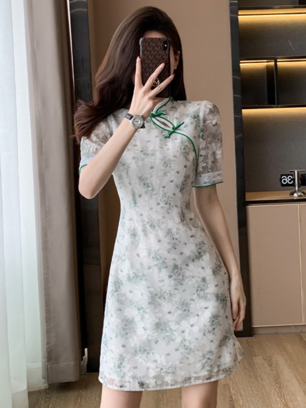 高级感国风短袖碎花连衣裙小个子气质收腰显瘦改良旗袍裙子女夏天
