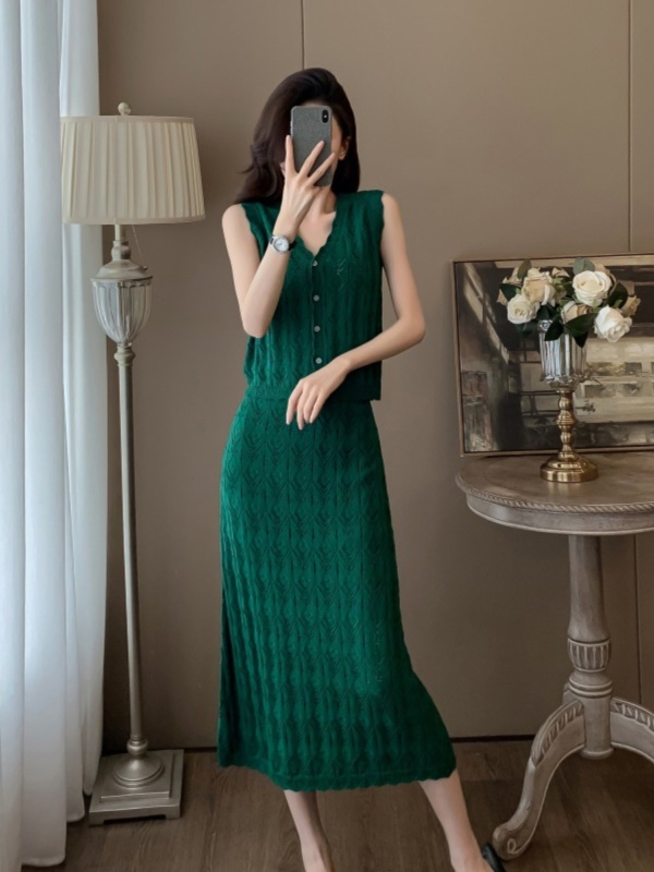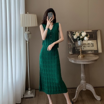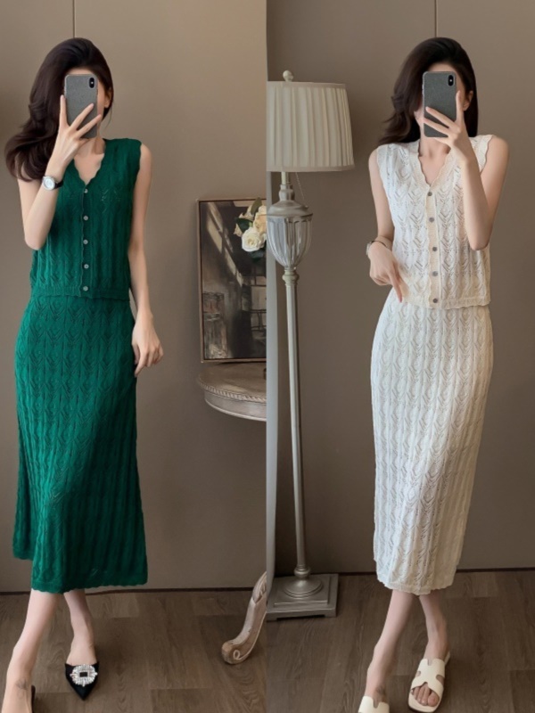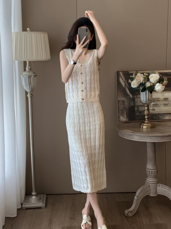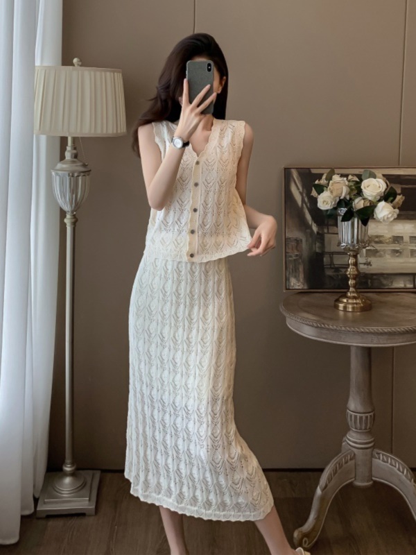 商品名称:棉花式钩花针织无袖背心镂空套装裙女复古半身裙两件套2025夏新款