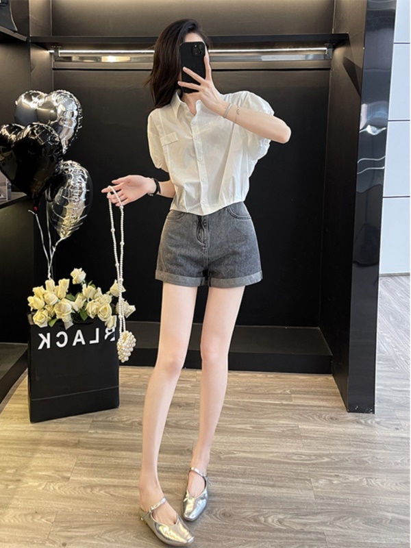 2025夏装搭配一整套白色职业短袖衬衫牛仔短裤休闲时尚两件套女装