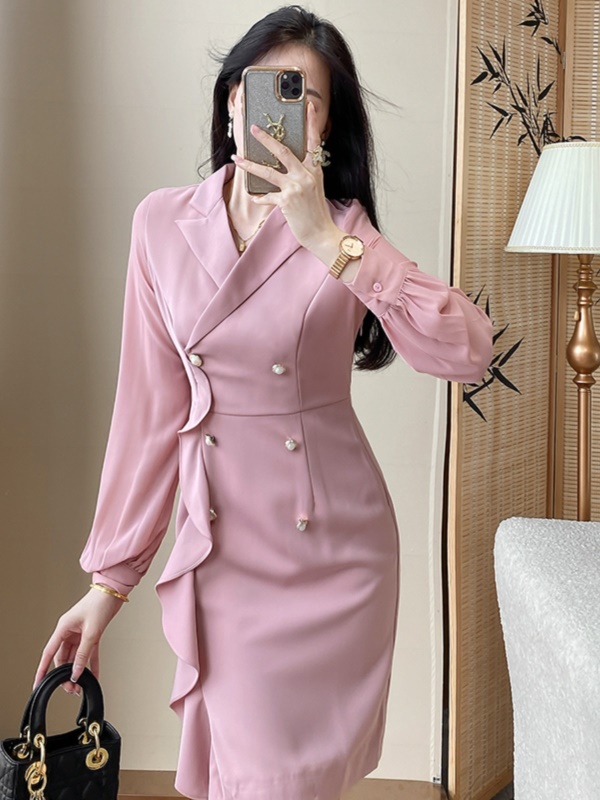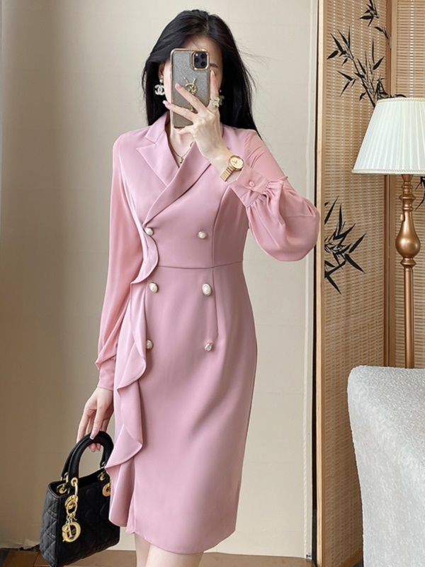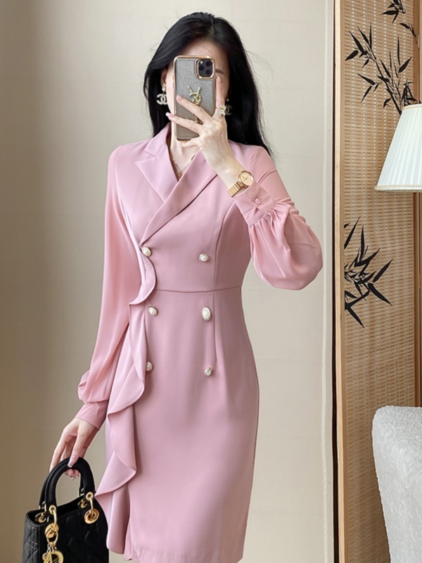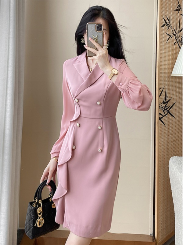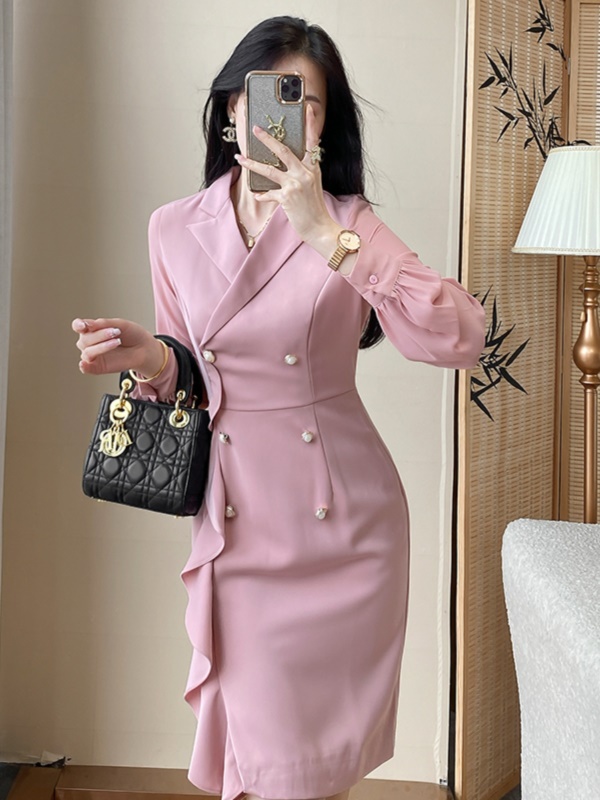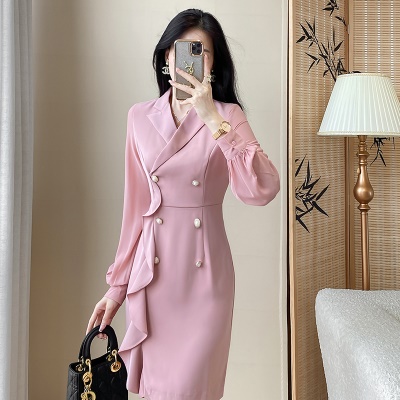 早秋粉色西装连衣裙长款高端轻奢气质礼服通勤女神范职业装长裙子