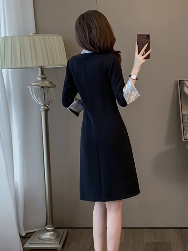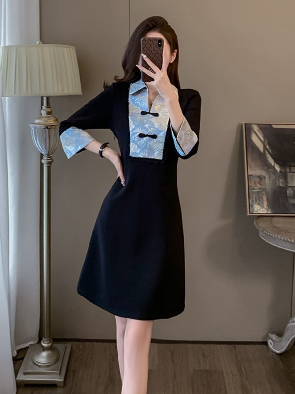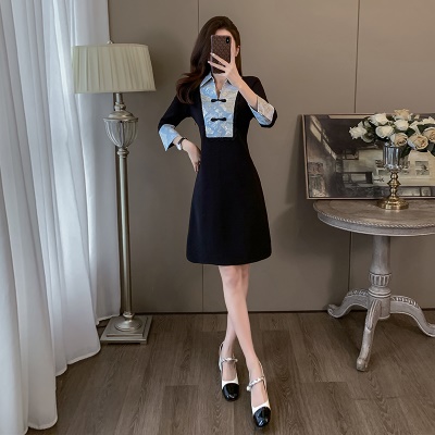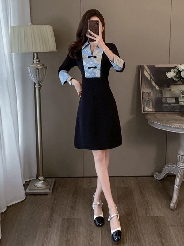 新中式国风七分袖连衣裙女早秋高端精致高级感气质开叉小黑色裙子