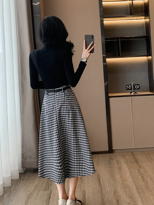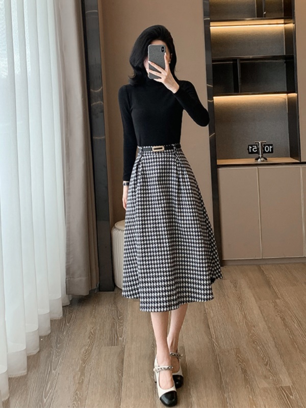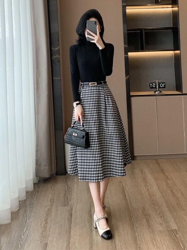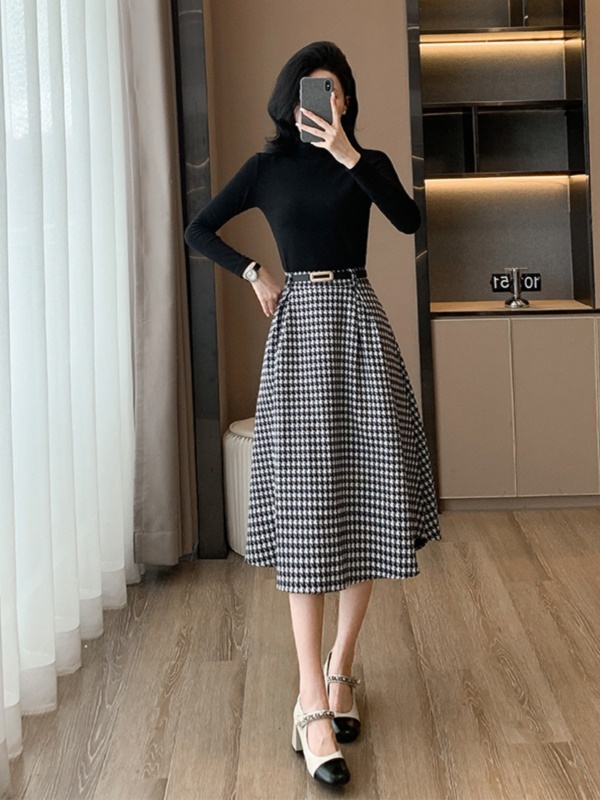 黑色上衣+千鸟格半裙 两件套