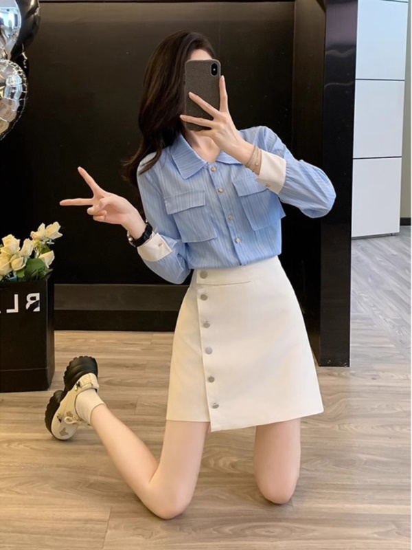 蓝色衬衫+白色短裙