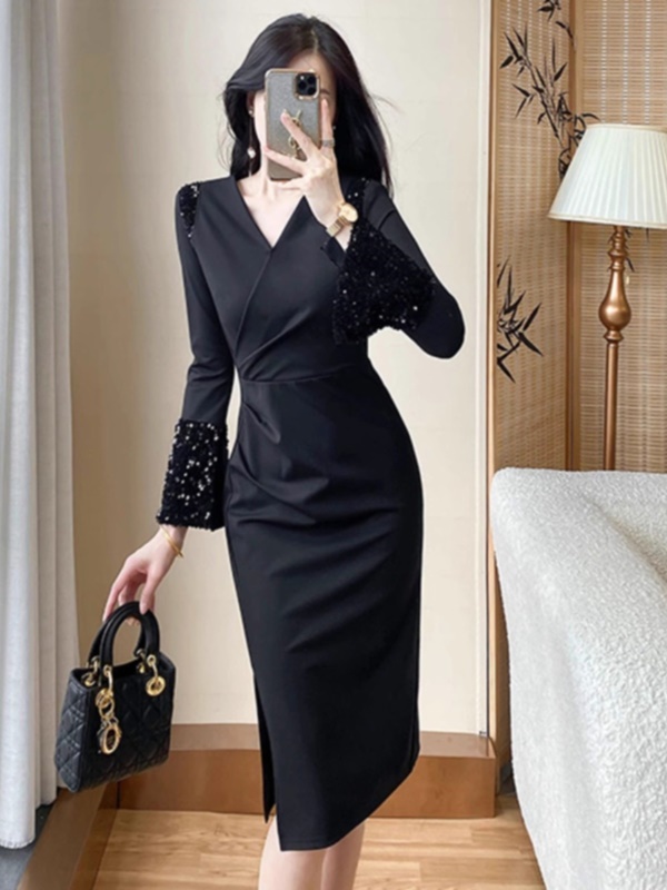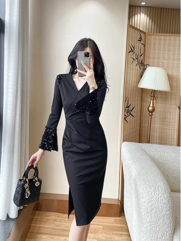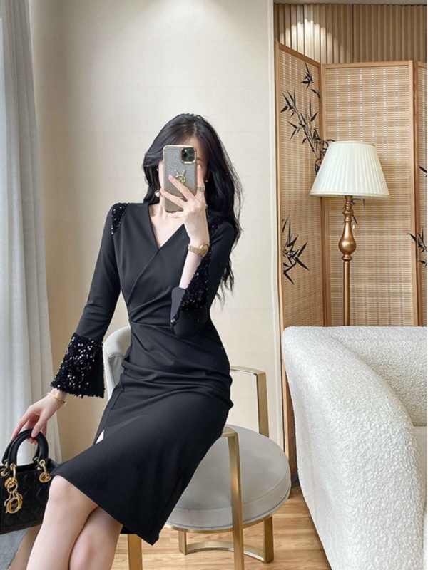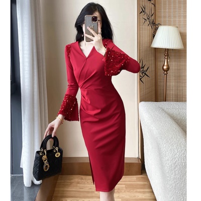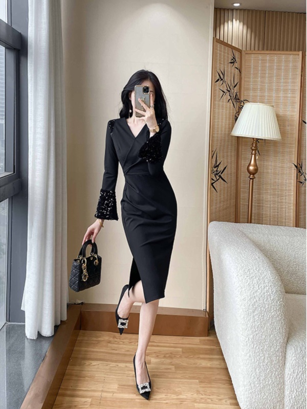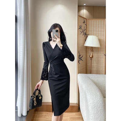秋季新款显瘦气质高级感晚礼服时尚V领宴会气质职业包臀连衣裙女