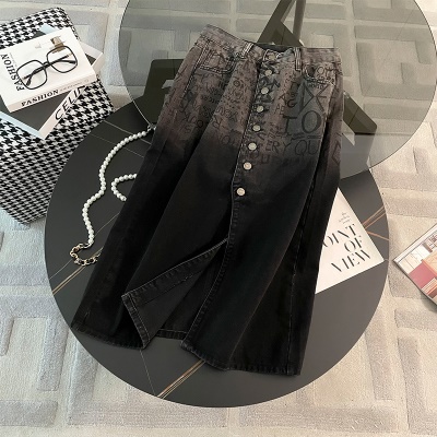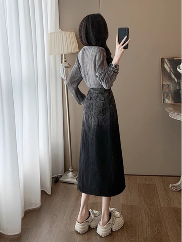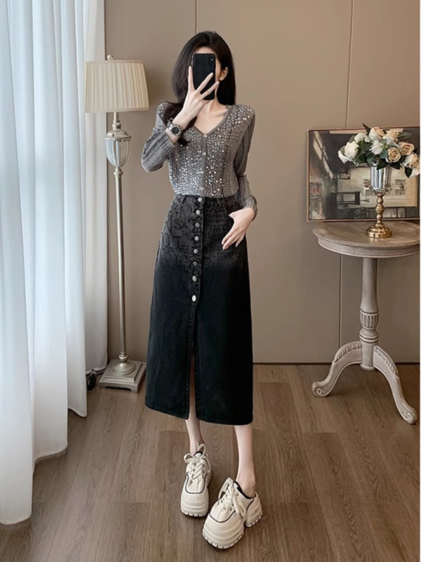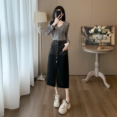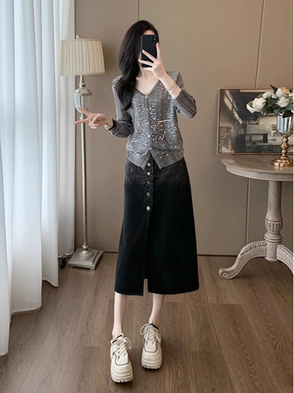 商品名称:早秋穿搭一整套装时尚女灰色亮片V领针织衫渐变牛仔半身裙两件套