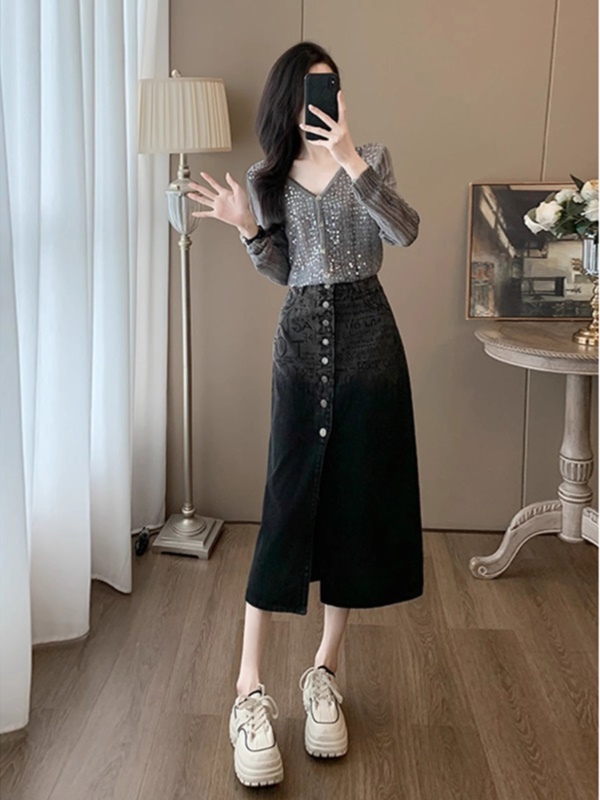 早秋穿搭一整套装时尚女灰色亮片V领针织衫渐变牛仔半身裙两件套