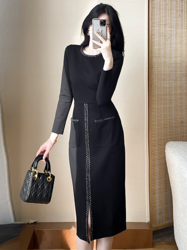 高级感赫本风气质小黑裙女秋冬新中式高腰显瘦过膝改良旗袍连衣裙