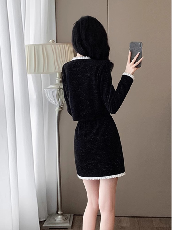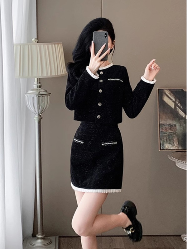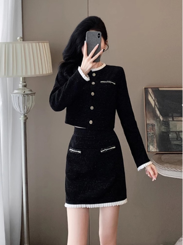 商品名称:黑色早秋穿搭套装高级感2025新款女显瘦气质上衣短裙两件套小个子