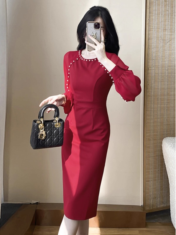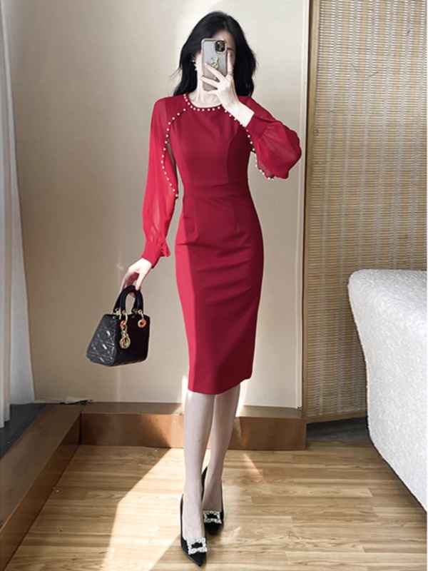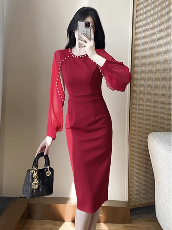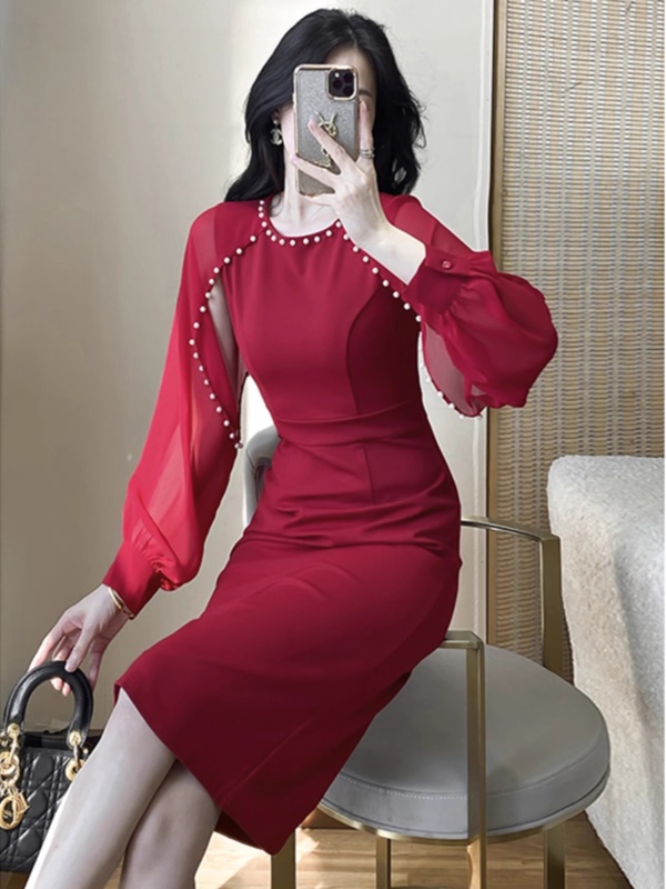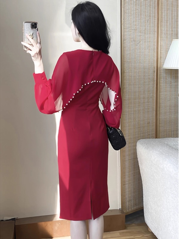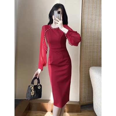婚礼礼服高端年会宴装主持红色敬酒服长袖钉珠高贵洋气包臀连衣裙