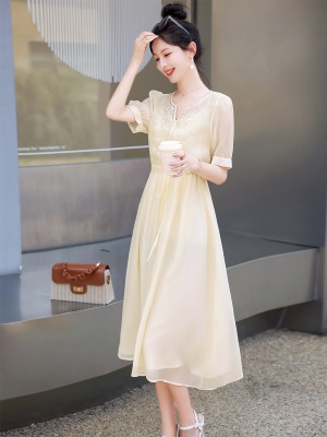 法式气质V领连衣裙女2025夏季新款高级感串珠褶皱收腰温柔风长裙