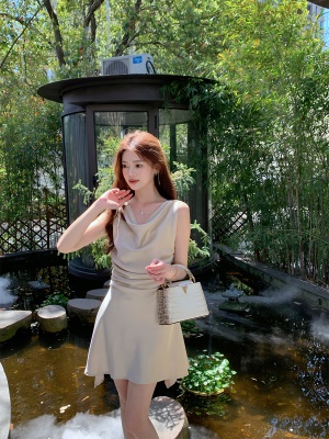 ByYou 夏季新款高级感香槟色缎面荡领露背连衣裙收腰显瘦a字短裙