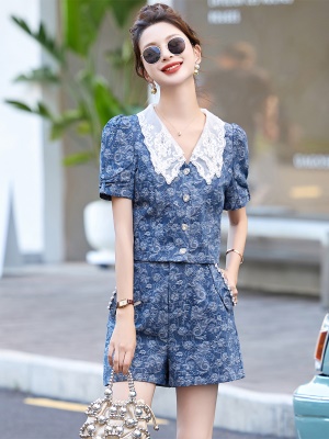 欧货小香风短裤套装女夏2025新款小个子拼色娃娃领牛仔两件套爆款