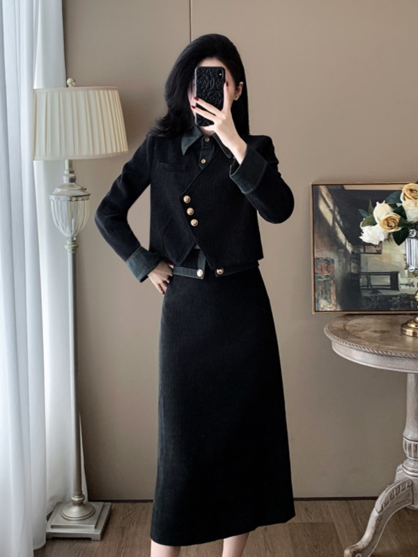 商品名称:2025秋季新款时尚假两件牛仔上衣两件套显瘦高级感气质半身裙套装