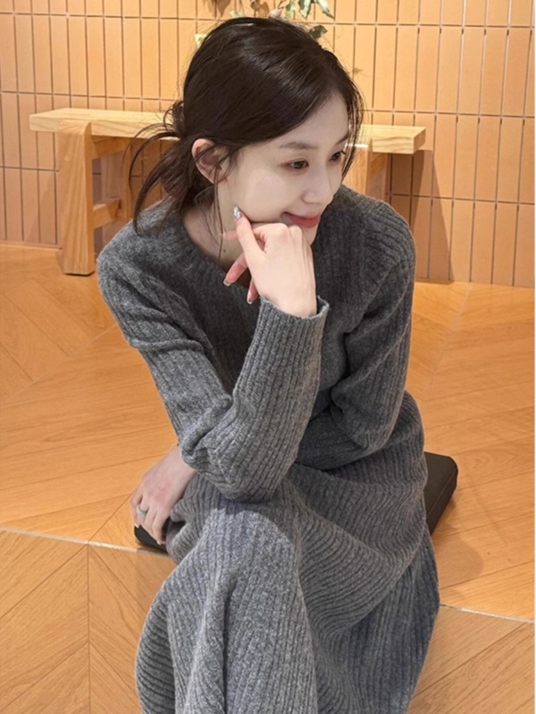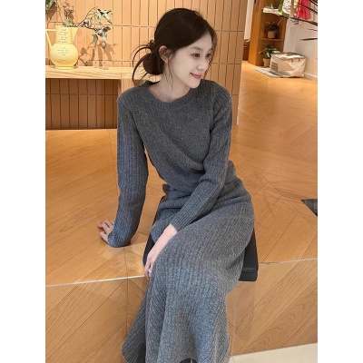 慵懒高级感灰色长袖针织毛衣连衣裙女秋冬大衣内搭打底两件套装裙