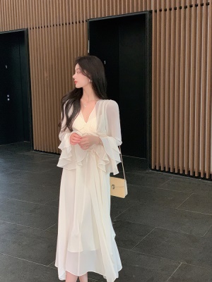 ByYou夏季新款茶歇法式白色雪纺连衣裙喇叭袖V领收腰气质仙女长裙