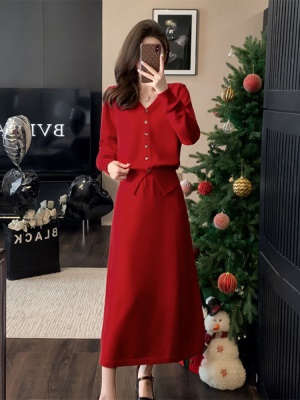 秋冬搭配礼服小香风套装裙新年红色毛衣针织针织开衫半身裙两件套