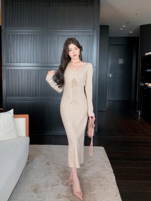 ByYou 冬季新款兔绒V领收腰针织连衣裙中长款修身内搭过膝毛衣裙
