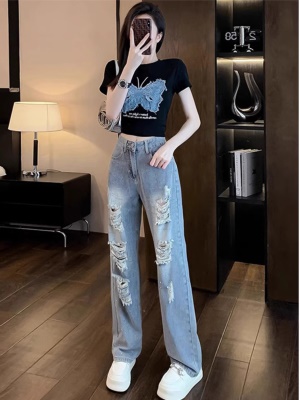 夏装搭配一整套时尚套装女夏季网红炸街高腰破洞牛仔裤两件套时髦