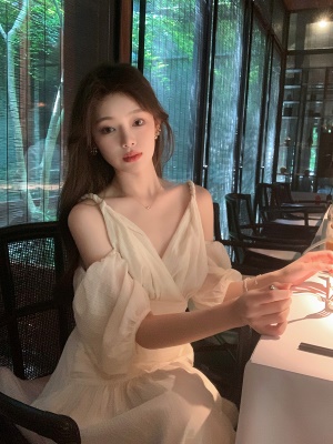 ByYou 夏季气质v领白色吊带连衣裙长款过膝收腰显瘦露肩仙女裙子
