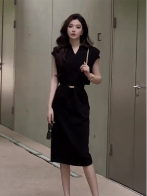 法式女神范气质职业小黑裙赫本风收腰显瘦黑色包臀v领连衣裙女夏
