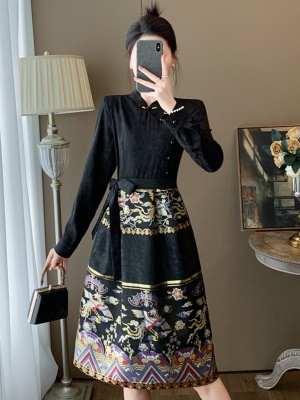 2025早秋女装新款国风旗袍连衣裙新中式民族风汉服收腰黑色马面裙