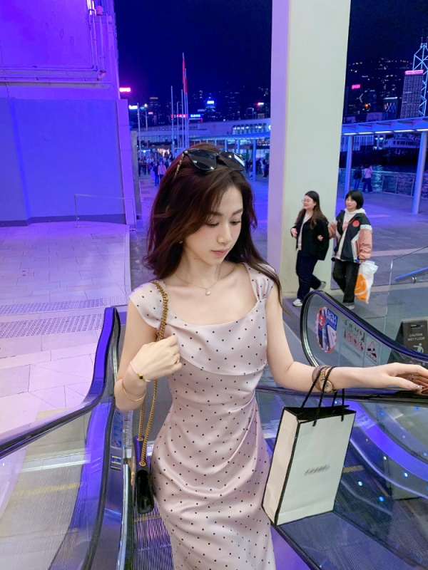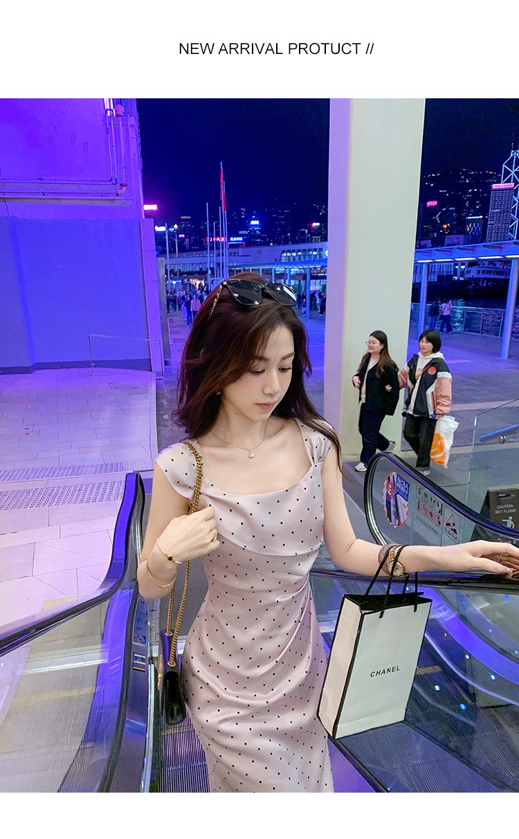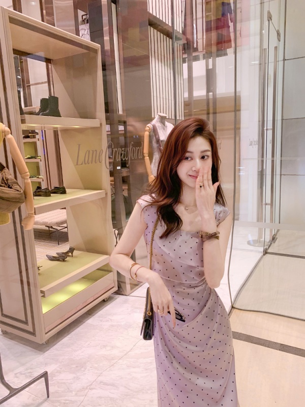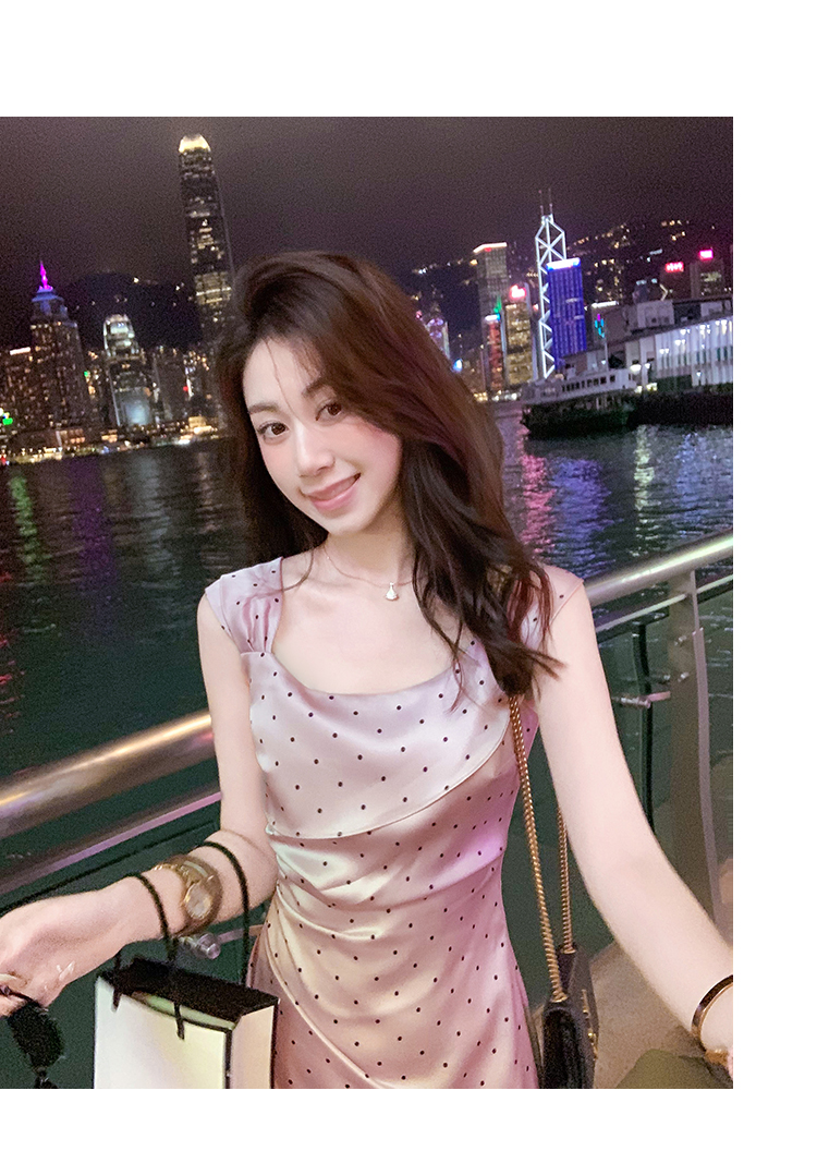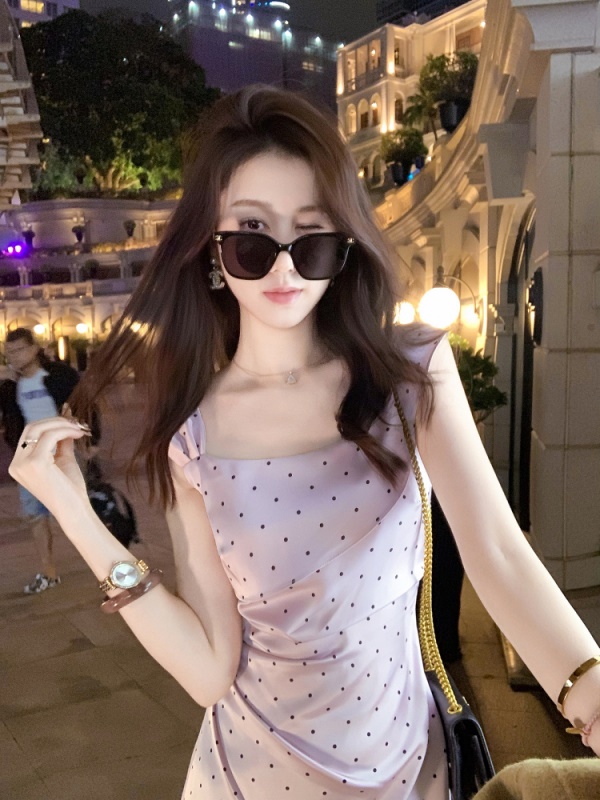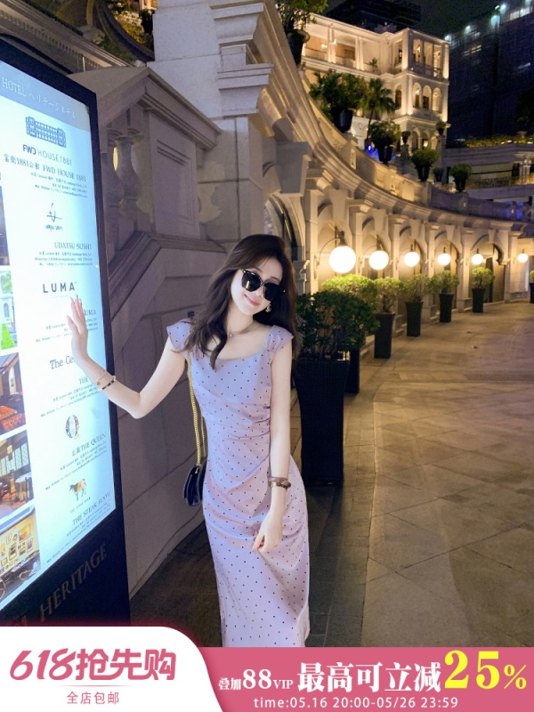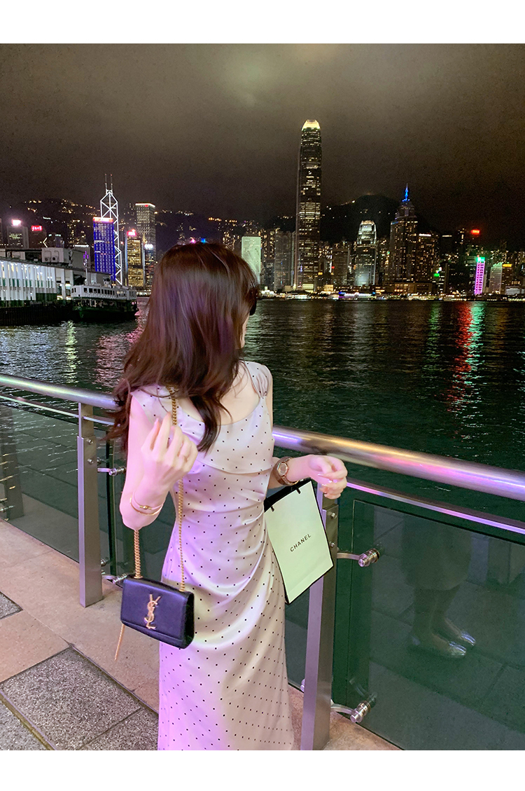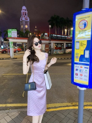 商品名称:斜领波点收腰连衣裙女气质性感法式裙子紫色高级长裙