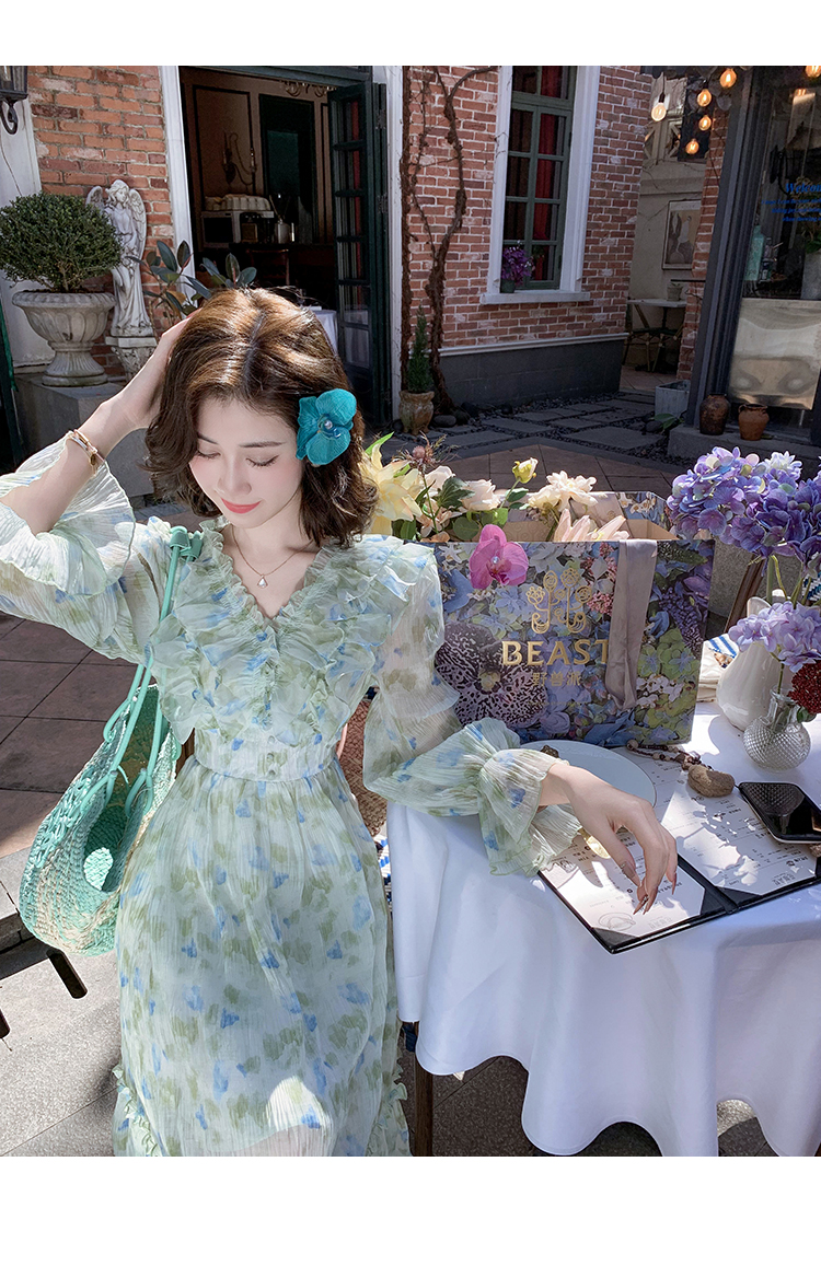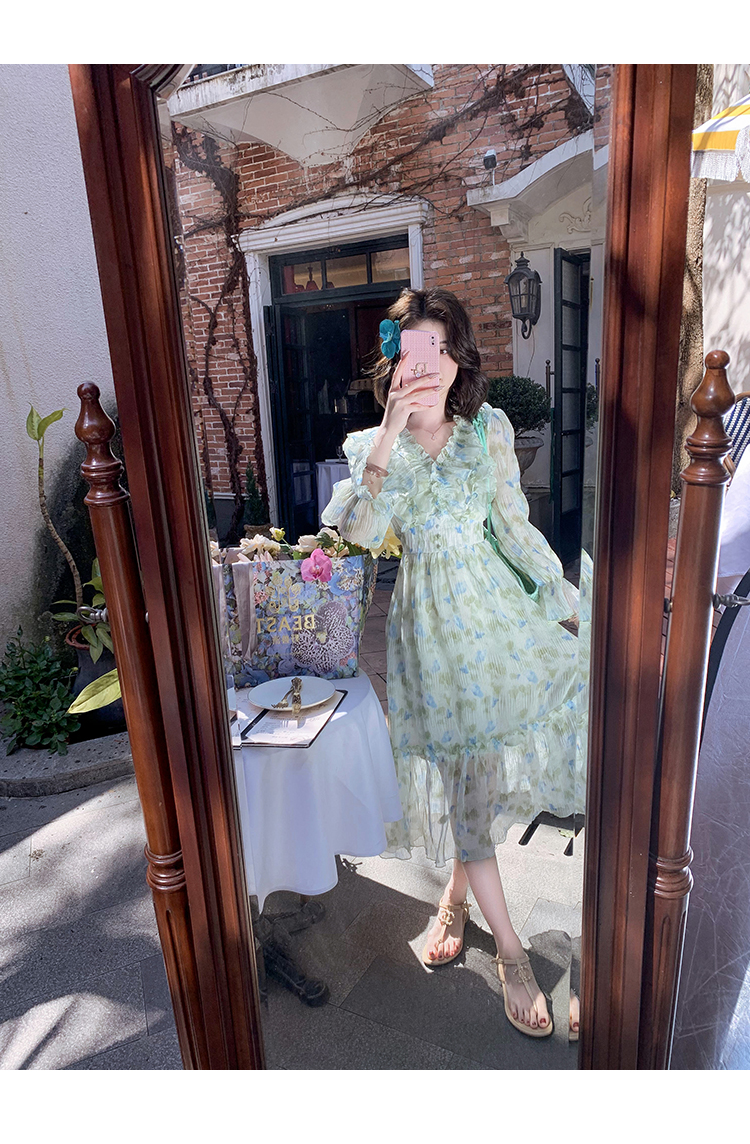 法式雪纺连衣裙女中长款碎花裙春夏温柔系收腰裙子