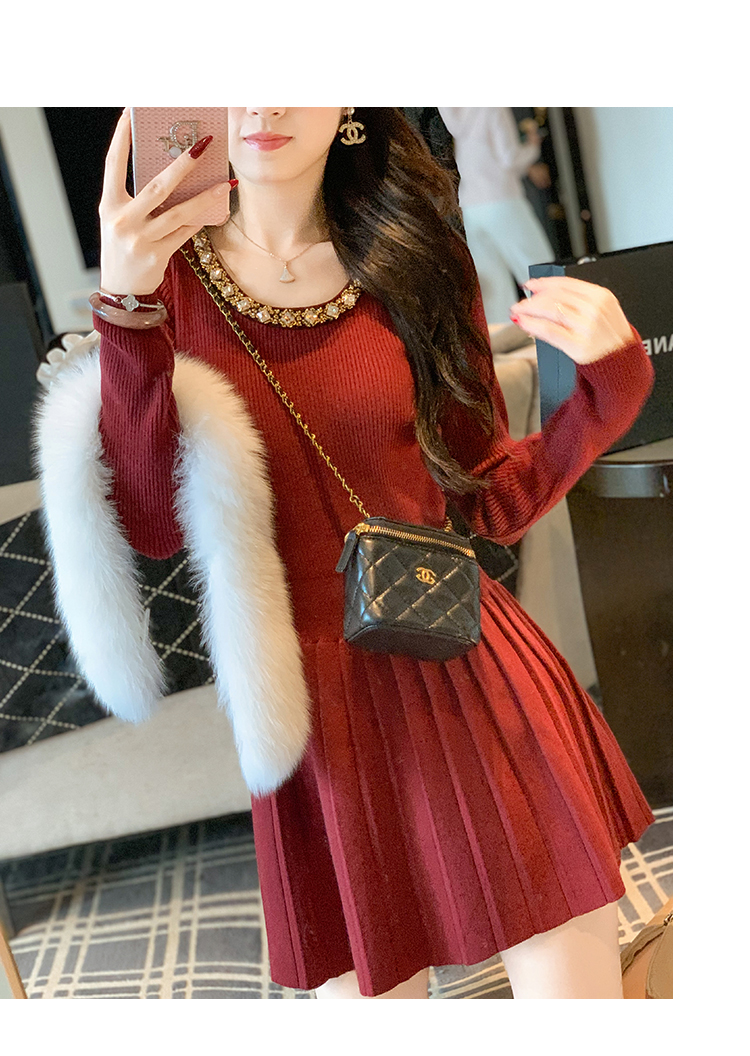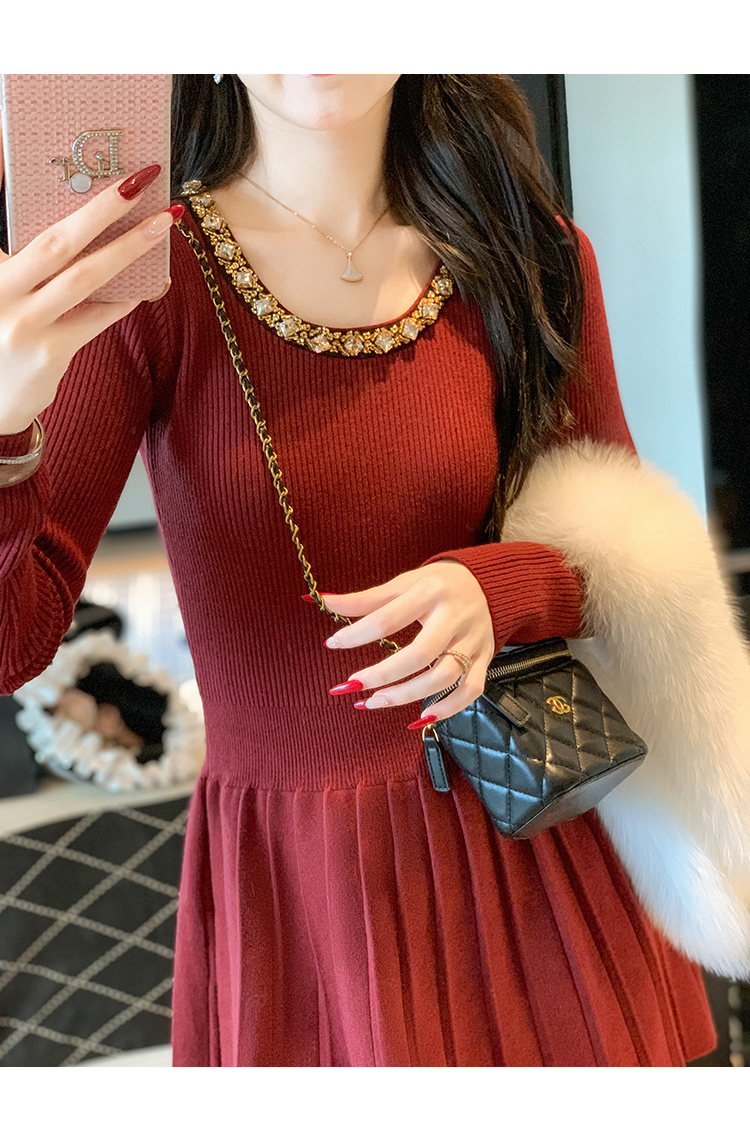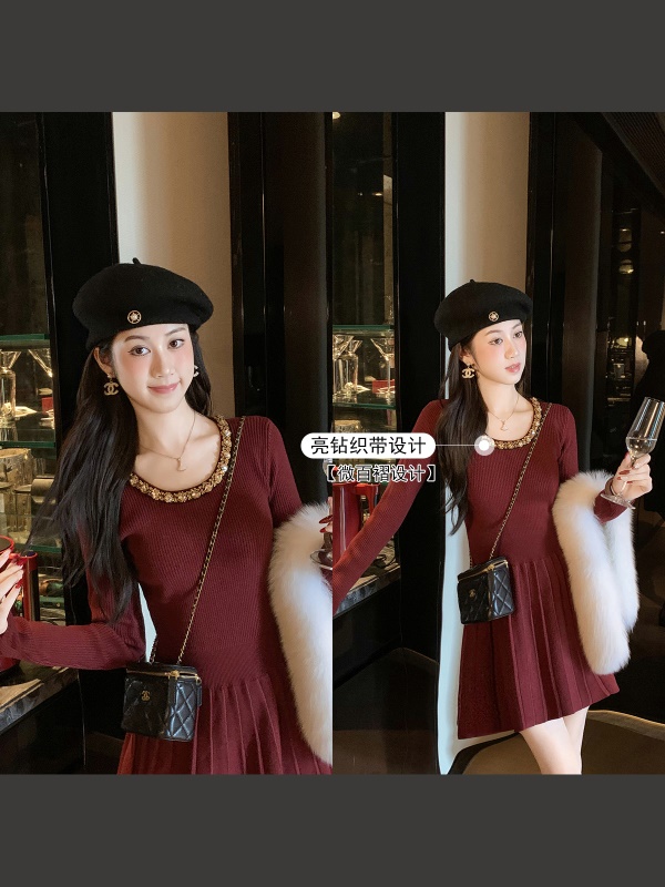 ByYou 冬季红色假两件纯欲挂脖针织连衣裙女收腰显瘦内搭毛衣裙子