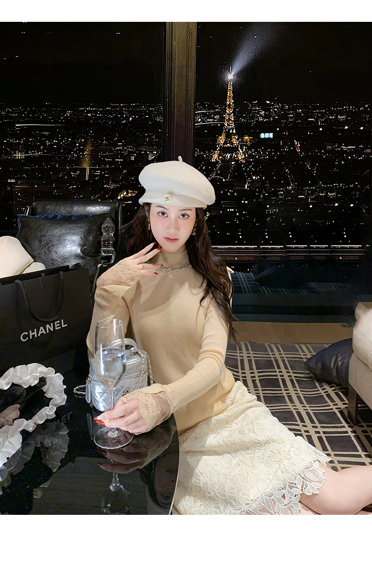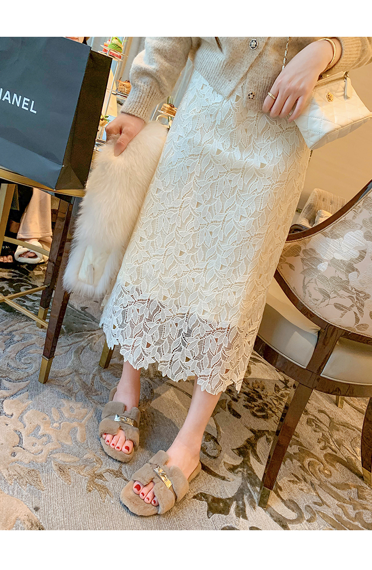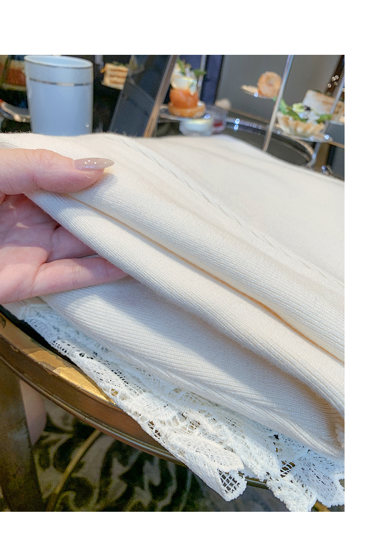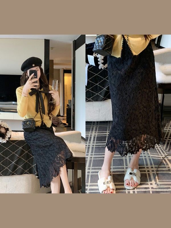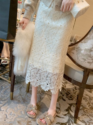 ByYou 冬季加绒侧开叉蕾丝白色针织半身裙长款过膝包臀鱼尾毛衣裙