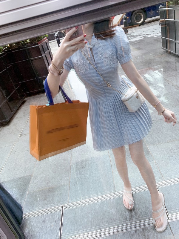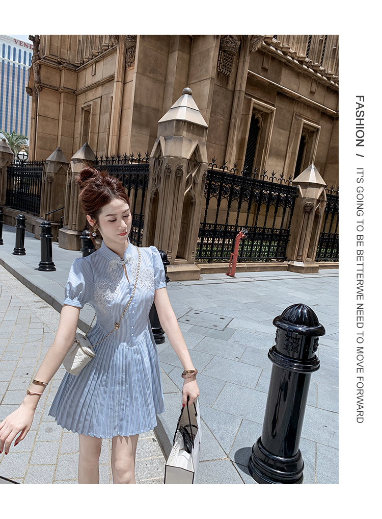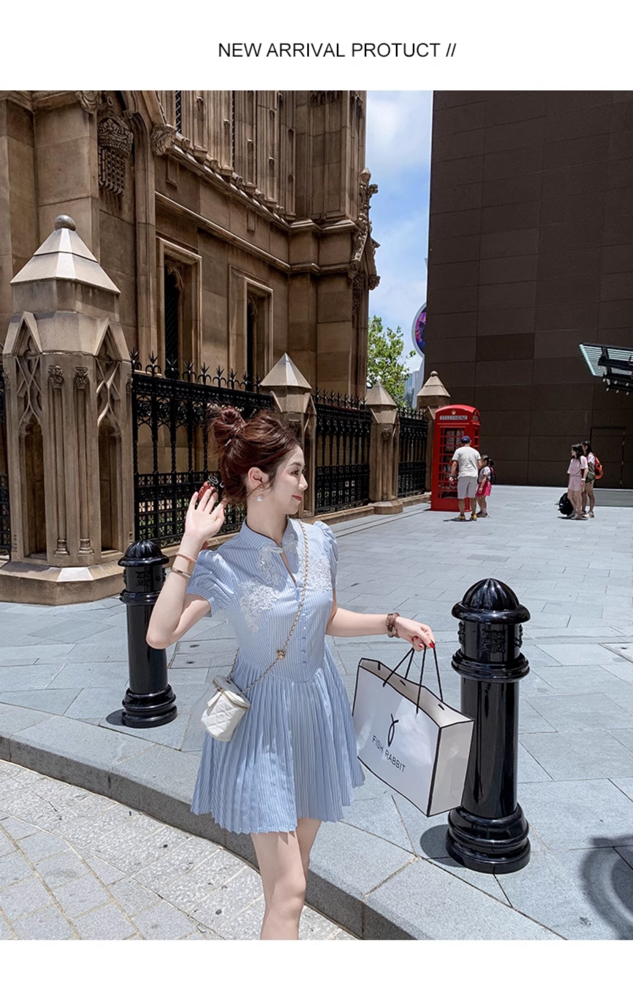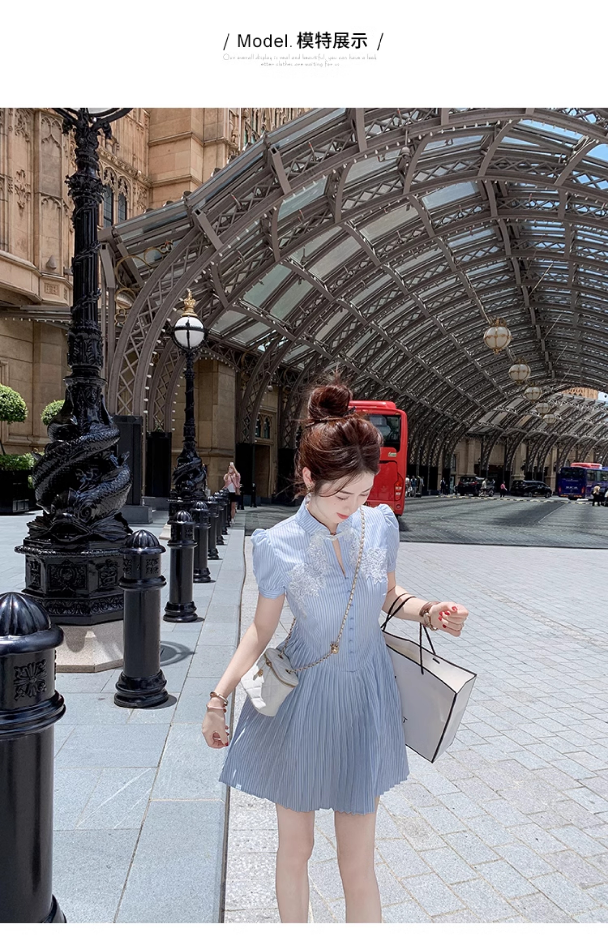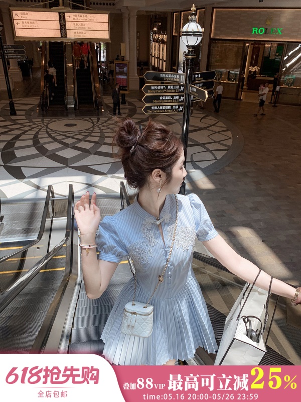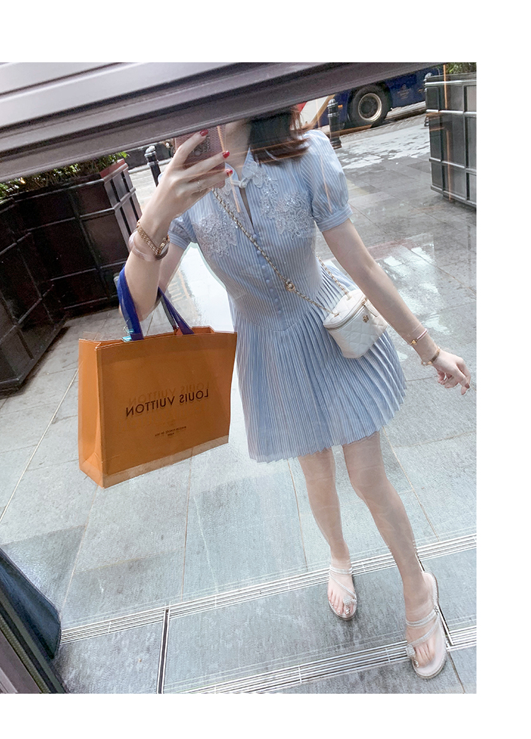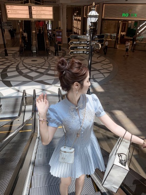商品名称:新中式蓝色条纹连衣裙女2025夏季新款高级感百褶裙子