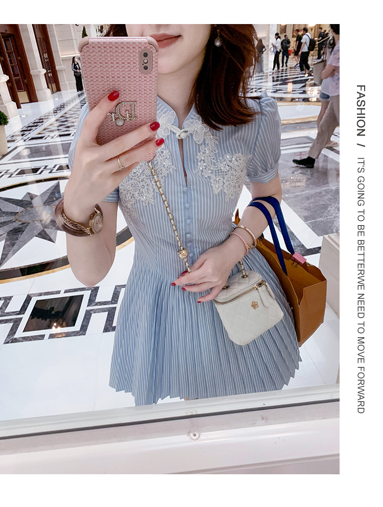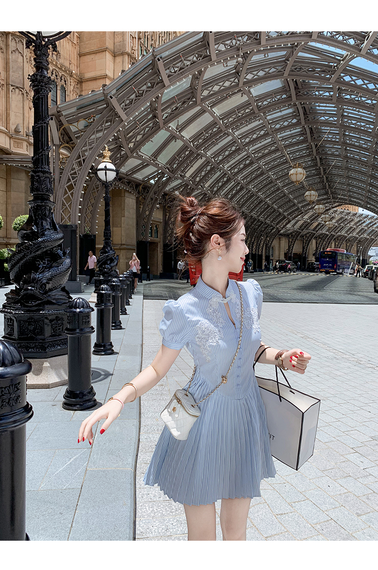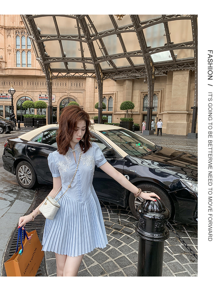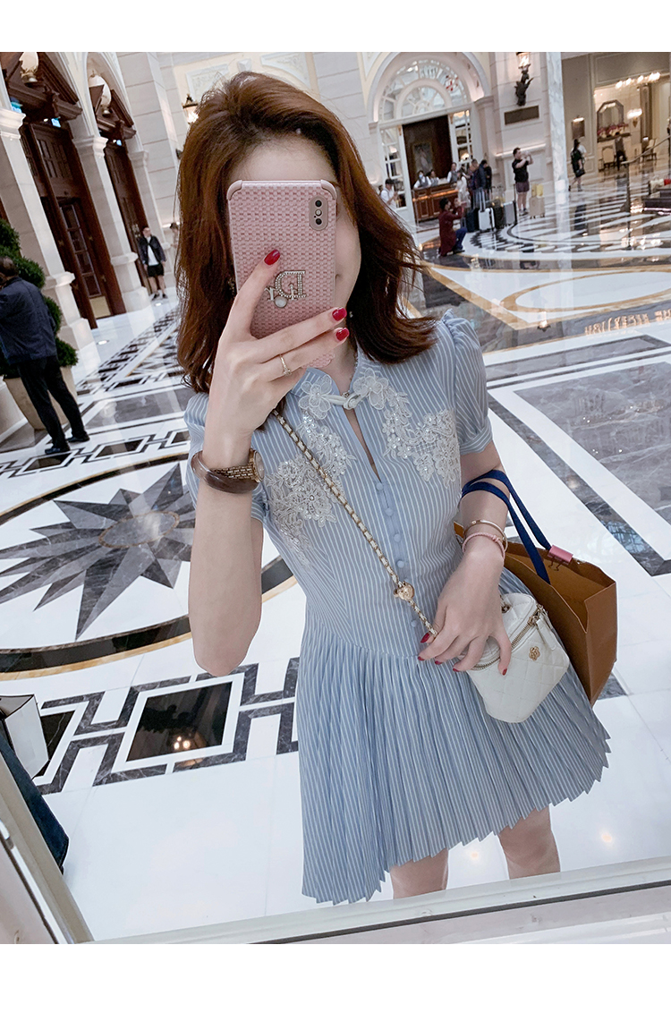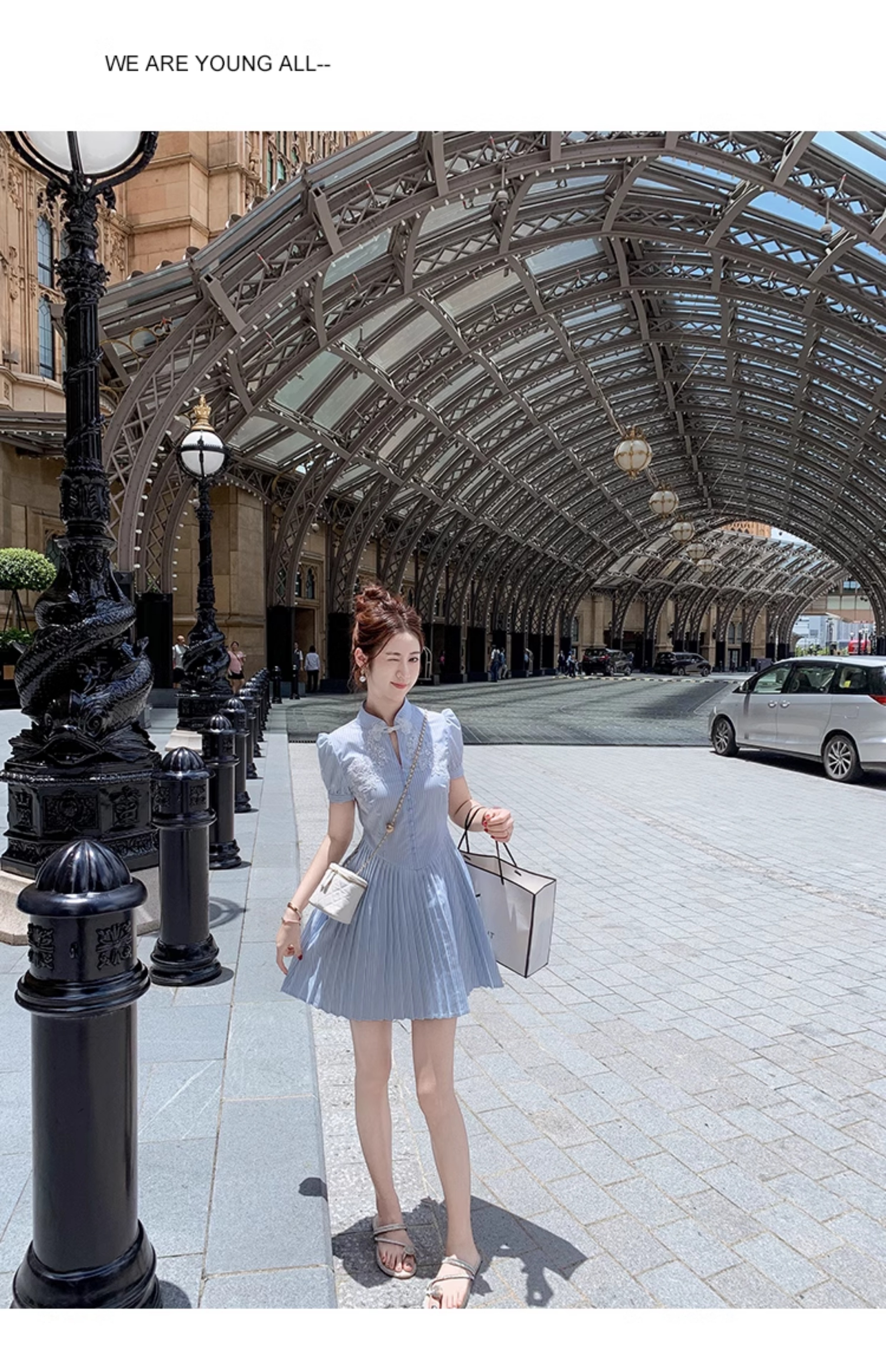 商品名称:新中式蓝色条纹连衣裙女2025夏季新款高级感百褶裙子