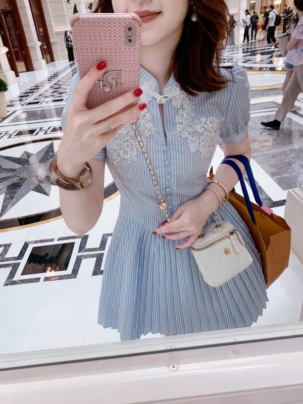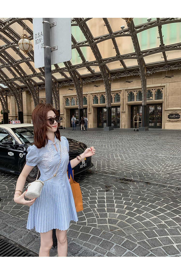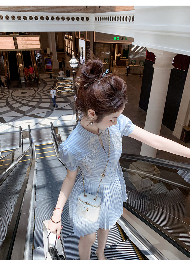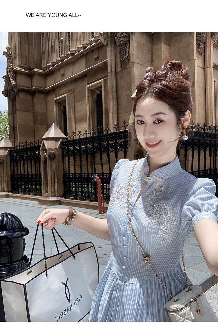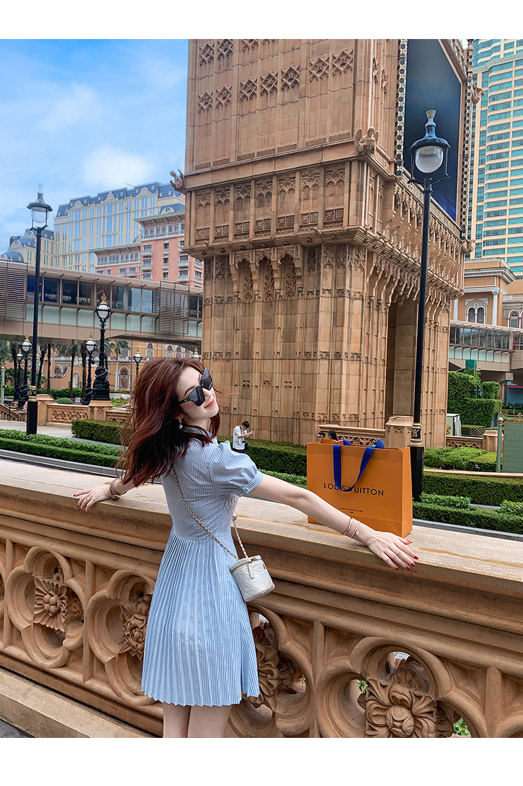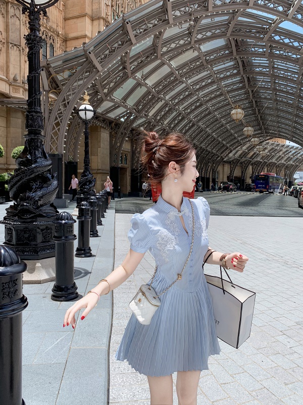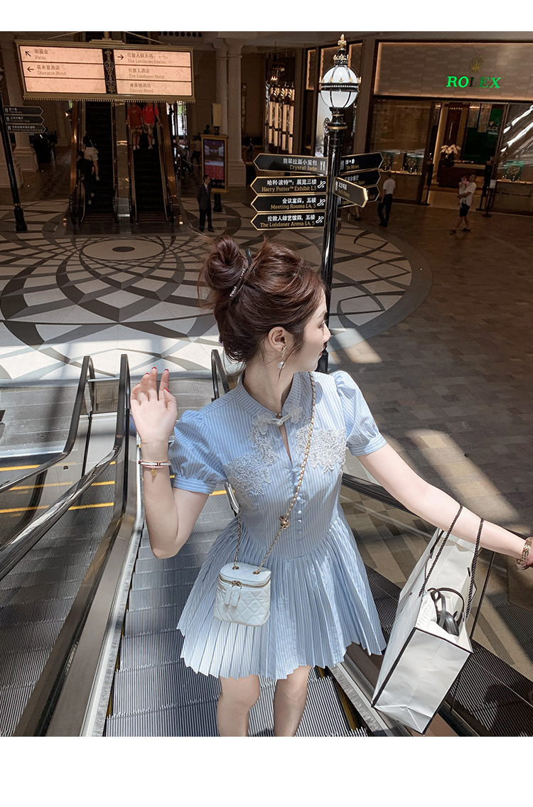 商品名称:新中式蓝色条纹连衣裙女2025夏季新款高级感百褶裙子